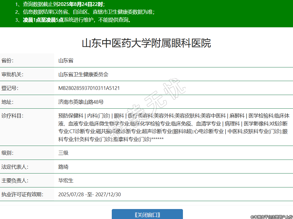 省份:山東省審批機(jī)關(guān):山東省衛(wèi)生健康委員會(huì)登記號(hào):MB280285937010311A5121地址:濟(jì)南市英雄山路48號(hào)診療科目:預(yù)防保健科 | 內(nèi)科(門診) | 眼科 | 醫(yī)療美容科;美容外科;美容皮膚科;美容中醫(yī)科 | 麻醉科 | 醫(yī)學(xué)檢驗(yàn)科;臨床體液、血液專業(yè);臨床微生物學(xué)專業(yè);臨床化學(xué)檢驗(yàn)專業(yè);臨床免疫、血清學(xué)專業(yè) | 病理科 | 醫(yī)學(xué)影像科;X線診斷專業(yè);CT診斷專業(yè);磁共振成像診斷專業(yè);超聲診斷專業(yè)(眼科B超);心電診斷專業(yè) | 中醫(yī)科;皮膚科專業(yè)(門診);眼科專業(yè);針灸科專業(yè)(門診);推拿科專業(yè)(門診)******級(jí)別:三級(jí)法定代表人:路琦主要負(fù)責(zé)人:畢宏生執(zhí)業(yè)許可證有效期:2025/07/28 -至- 2027/12/30 -