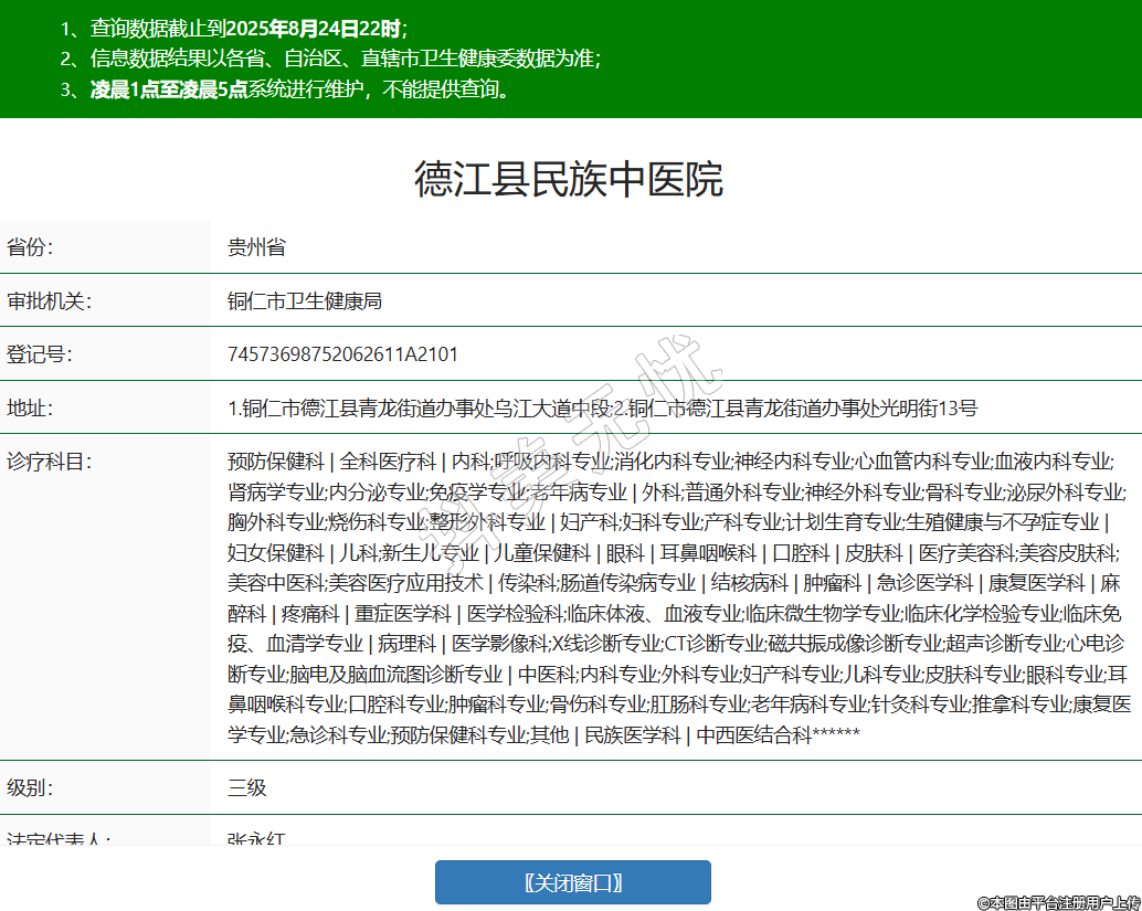 省份:貴州省審批機(jī)關(guān):銅仁市衛(wèi)生健康局登記號(hào):74573698752062611A2101地址:1.銅仁市德江縣青龍街道辦事處烏江大道中段;2.銅仁市德江縣青龍街道辦事處光明街13號(hào)診療科目:預(yù)防保健科 | 全科醫(yī)療科 | 內(nèi)科;呼吸內(nèi)科專業(yè);消化內(nèi)科專業(yè);神經(jīng)內(nèi)科專業(yè);心血管內(nèi)科專業(yè);血液內(nèi)科專業(yè);腎病學(xué)專業(yè);內(nèi)分泌專業(yè);免疫學(xué)專業(yè);老年病專業(yè) | 外科;普通外科專業(yè);神經(jīng)外科專業(yè);骨科專業(yè);泌尿外科專業(yè);胸外科專業(yè);燒傷科專業(yè);整形外科專業(yè) | 婦產(chǎn)科;婦科專業(yè);產(chǎn)科專業(yè);計(jì)劃生育專業(yè);生殖健康與不孕癥專業(yè) | 婦女保健科 | 兒科;新生兒專業(yè) | 兒童保健科 | 眼科 | 耳鼻咽喉科 | 口腔科 | 皮膚科 | 醫(yī)療美容科;美容皮膚科;美容中醫(yī)科;美容醫(yī)療應(yīng)用技術(shù) | 傳染科;腸道傳染病專業(yè) | 結(jié)核病科 | 腫瘤科 | 急診醫(yī)學(xué)科 | 康復(fù)醫(yī)學(xué)科 | 麻醉科 | 疼痛科 | 重癥醫(yī)學(xué)科 | 醫(yī)學(xué)檢驗(yàn)科;臨床體液、血液專業(yè);臨床微生物學(xué)專業(yè);臨床化學(xué)檢驗(yàn)專業(yè);臨床免疫、血清學(xué)專業(yè) | 病理科 | 醫(yī)學(xué)影像科;X線診斷專業(yè);CT診斷專業(yè);磁共振成像診斷專業(yè);超聲診斷專業(yè);心電診斷專業(yè);腦電及腦血流圖診斷專業(yè) | 中醫(yī)科;內(nèi)科專業(yè);外科專業(yè);婦產(chǎn)科專業(yè);兒科專業(yè);皮膚科專業(yè);眼科專業(yè);耳鼻咽喉科專業(yè);口腔科專業(yè);腫瘤科專業(yè);骨傷科專業(yè);肛腸科專業(yè);老年病科專業(yè);針灸科專業(yè);推拿科專業(yè);康復(fù)醫(yī)學(xué)專業(yè);急診科專業(yè);預(yù)防保健科專業(yè);其他 | 民族醫(yī)學(xué)科 | 中西醫(yī)結(jié)合科******級(jí)別:三級(jí)法定代表人:張永紅主要負(fù)責(zé)人:張永紅執(zhí)業(yè)許可證有效期:2015/05/09 -至- 2030/05/08 -