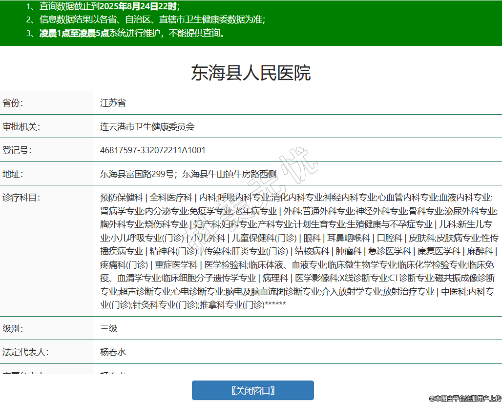省份:江蘇省審批機(jī)關(guān):連云港市衛(wèi)生健康委員會登記號:46817597-332072211A1001地址:東??h富國路299號;東海縣牛山鎮(zhèn)牛房路西側(cè)診療科目:預(yù)防保健科 | 全科醫(yī)療科 | 內(nèi)科;呼吸內(nèi)科專業(yè);消化內(nèi)科專業(yè);神經(jīng)內(nèi)科專業(yè);心血管內(nèi)科專業(yè);血液內(nèi)科專業(yè);腎病學(xué)專業(yè);內(nèi)分泌專業(yè);免疫學(xué)專業(yè);老年病專業(yè) | 外科;普通外科專業(yè);神經(jīng)外科專業(yè);骨科專業(yè);泌尿外科專業(yè);胸外科專業(yè);燒傷科專業(yè) | 婦產(chǎn)科;婦科專業(yè);產(chǎn)科專業(yè);計劃生育專業(yè);生殖健康與不孕癥專業(yè) | 兒科;新生兒專業(yè);小兒呼吸專業(yè)(門診) | 小兒外科 | 兒童保健科(門診) | 眼科 | 耳鼻咽喉科 | 口腔科 | 皮膚科;皮膚病專業(yè);性傳播疾病專業(yè) | 精神科(門診) | 傳染科;肝炎專業(yè)(門診) | 結(jié)核病科 | 腫瘤科 | 急診醫(yī)學(xué)科 | 康復(fù)醫(yī)學(xué)科 | 麻醉科 | 疼痛科(門診) | 重癥醫(yī)學(xué)科 | 醫(yī)學(xué)檢驗科;臨床體液、血液專業(yè);臨床微生物學(xué)專業(yè);臨床化學(xué)檢驗專業(yè);臨床免疫、血清學(xué)專業(yè);臨床細(xì)胞分子遺傳學(xué)專業(yè) | 病理科 | 醫(yī)學(xué)影像科;X線診斷專業(yè);CT診斷專業(yè);磁共振成像診斷專業(yè);超聲診斷專業(yè);心電診斷專業(yè);腦電及腦血流圖診斷專業(yè);介入放射學(xué)專業(yè);放射治療專業(yè) | 中醫(yī)科;內(nèi)科專業(yè)(門診);針灸科專業(yè)(門診);推拿科專業(yè)(門診)******級別:三級法定代表人:楊春水主要負(fù)責(zé)人:楊春水執(zhí)業(yè)許可證有效期:2020/12/04 -至- 2035/12/03 -