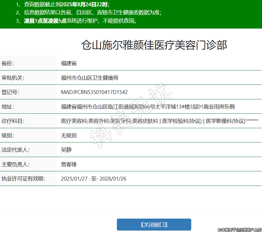 省份:福建省審批機(jī)關(guān):福州市倉山區(qū)衛(wèi)生健康局登記號:MADJPCBN535010417D1542地址:福建省福州市倉山區(qū)臨江街道觀海路66號太平洋城13#樓3層01商業(yè)用房東側(cè)診療科目:醫(yī)療美容科;美容外科;美容牙科;美容皮膚科 | 醫(yī)學(xué)檢驗(yàn)科(協(xié)議) | 醫(yī)學(xué)影像科(協(xié)議)******級別:無級別法定代表人:吳靜主要負(fù)責(zé)人:賈春鋒執(zhí)業(yè)許可證有效期:2025/01/27 -至- 2028/01/26 -