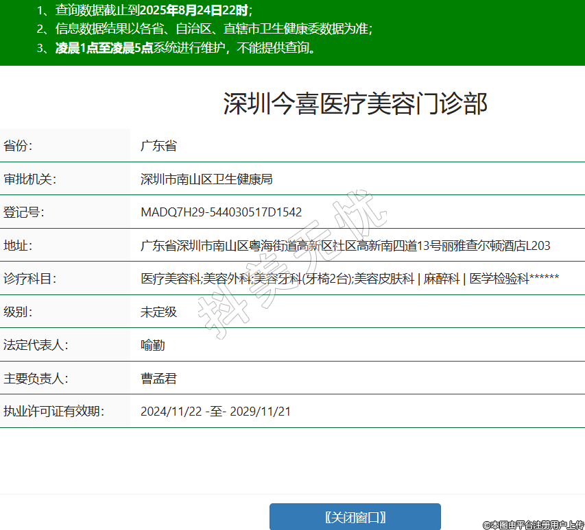 省份:廣東省審批機關(guān):深圳市南山區(qū)衛(wèi)生健康局登記號:MADQ7H29-544030517D1542地址:廣東省深圳市南山區(qū)粵海街道高新區(qū)社區(qū)高新南四道13號麗雅查爾頓酒店L203診療科目:醫(yī)療美容科;美容外科;美容牙科(牙椅2臺);美容皮膚科 | 麻醉科 | 醫(yī)學檢驗科******級別:未定級法定代表人:喻勤主要負責人:曹孟君執(zhí)業(yè)許可證有效期:2024/11/22 -至- 2029/11/21 -