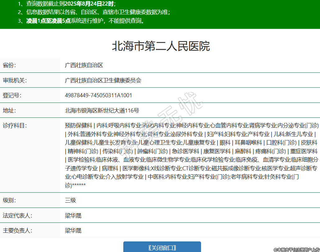 省份:廣西壯族自治區(qū)審批機(jī)關(guān):廣西壯族自治區(qū)衛(wèi)生健康委員會(huì)登記號(hào):49878449-745050311A1001地址:北海市銀海區(qū)新世紀(jì)大道116號(hào)診療科目:預(yù)防保健科 | 內(nèi)科;呼吸內(nèi)科專業(yè);消化內(nèi)科專業(yè);神經(jīng)內(nèi)科專業(yè);心血管內(nèi)科專業(yè);腎病學(xué)專業(yè);內(nèi)分泌專業(yè)(門診) | 外科;普通外科專業(yè);神經(jīng)外科專業(yè);骨科專業(yè);泌尿外科專業(yè) | 婦產(chǎn)科;婦科專業(yè);產(chǎn)科專業(yè) | 兒科;新生兒專業(yè) | 兒童保健科;兒童生長(zhǎng)發(fā)育專業(yè);兒童心理衛(wèi)生專業(yè);兒童康復(fù)專業(yè) | 眼科 | 耳鼻咽喉科 | 口腔科(門診) | 皮膚科 | 精神科(門診) | 傳染科(門診) | 腫瘤科(門診) | 急診醫(yī)學(xué)科 | 康復(fù)醫(yī)學(xué)科 | 麻醉科 | 疼痛科(門診) | 重癥醫(yī)學(xué)科 | 醫(yī)學(xué)檢驗(yàn)科;臨床體液、血液專業(yè);臨床微生物學(xué)專業(yè);臨床化學(xué)檢驗(yàn)專業(yè);臨床免疫、血清學(xué)專業(yè);臨床細(xì)胞分子遺傳學(xué)專業(yè) | 病理科 | 醫(yī)學(xué)影像科;X線診斷專業(yè);CT診斷專業(yè);磁共振成像診斷專業(yè);核醫(yī)學(xué)專業(yè);超聲診斷專業(yè);心電診斷專業(yè);介入放射學(xué)專業(yè) | 中醫(yī)科;內(nèi)科專業(yè);婦產(chǎn)科專業(yè)(門診);老年病科專業(yè);針灸科專業(yè)(門診)******級(jí)別:三級(jí)法定代表人:梁華晟主要負(fù)責(zé)人:梁華晟執(zhí)業(yè)許可證有效期:2022/12/16 -至- 2037/12/15 -