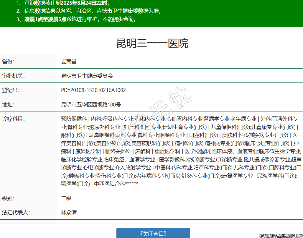 省份:云南省審批機(jī)關(guān):昆明市衛(wèi)生健康委員會(huì)登記號(hào):PDY20108-153010216A1002地址:昆明市五華區(qū)西壩路100號(hào)診療科目:預(yù)防保健科 | 內(nèi)科;呼吸內(nèi)科專業(yè);消化內(nèi)科專業(yè);心血管內(nèi)科專業(yè);腎病學(xué)專業(yè);老年病專業(yè) | 外科;普通外科專業(yè);骨科專業(yè);泌尿外科專業(yè) | 婦產(chǎn)科;婦科專業(yè);計(jì)劃生育專業(yè)(門診) | 兒童保健科(門診);兒童康復(fù)專業(yè)(門診) | 眼科(門診) | 耳鼻咽喉科;耳科專業(yè);鼻科專業(yè);咽喉科專業(yè) | 口腔科(門診) | 皮膚科;性傳播疾病專業(yè)(門診) | 醫(yī)療美容科(門診);美容外科(門診);美容皮膚科(門診) | 精神科(門診);精神病專業(yè)(門診);臨床心理專業(yè)(門診) | 腫瘤科 | 康復(fù)醫(yī)學(xué)科 | 臨終關(guān)懷科 | 麻醉科 | 重癥醫(yī)學(xué)科 | 醫(yī)學(xué)檢驗(yàn)科;臨床體液、血液專業(yè);臨床微生物學(xué)專業(yè);臨床化學(xué)檢驗(yàn)專業(yè);臨床免疫、血清學(xué)專業(yè) | 醫(yī)學(xué)影像科;X線診斷專業(yè);CT診斷專業(yè);磁共振成像診斷專業(yè);超聲診斷專業(yè);心電診斷專業(yè);介入放射學(xué)專業(yè) | 中醫(yī)科;內(nèi)科專業(yè);婦產(chǎn)科專業(yè)(門診);兒科專業(yè)(門診);口腔科專業(yè)(門診);腫瘤科專業(yè);骨傷科專業(yè)(門診);老年病科專業(yè)(門診);針灸科專業(yè)(門診);康復(fù)醫(yī)學(xué)專業(yè) | 民族醫(yī)學(xué)科(門診);蒙醫(yī)學(xué)(門診) | 中西醫(yī)結(jié)合科******級(jí)別:二級(jí)法定代表人:林眾清主要負(fù)責(zé)人:張道連執(zhí)業(yè)許可證有效期:2025/08/13 -至- 2032/10/30 -
