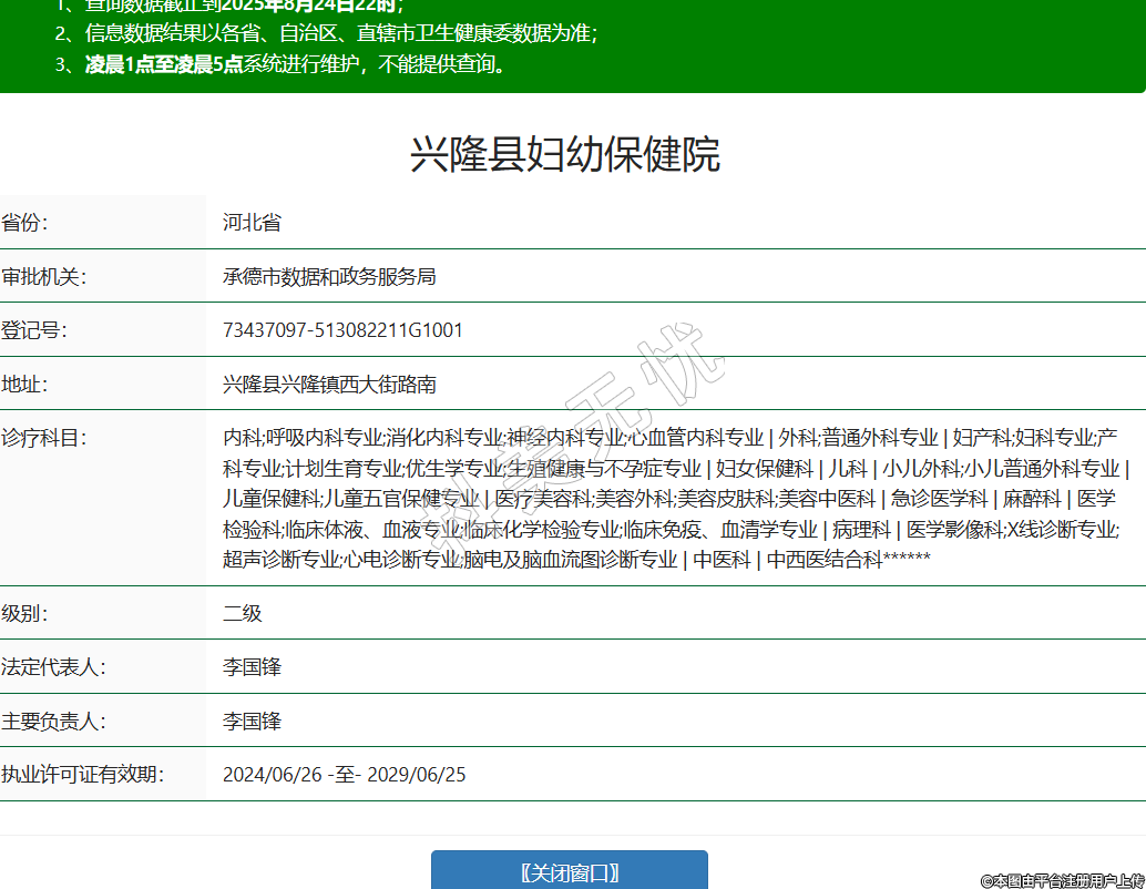 省份:河北省審批機關(guān):承德市數(shù)據(jù)和政務服務局登記號:73437097-513082211G1001地址:興隆縣興隆鎮(zhèn)西大街路南診療科目:內(nèi)科;呼吸內(nèi)科專業(yè);消化內(nèi)科專業(yè);神經(jīng)內(nèi)科專業(yè);心血管內(nèi)科專業(yè) | 外科;普通外科專業(yè) | 婦產(chǎn)科;婦科專業(yè);產(chǎn)科專業(yè);計劃生育專業(yè);優(yōu)生學專業(yè);生殖健康與不孕癥專業(yè) | 婦女保健科 | 兒科 | 小兒外科;小兒普通外科專業(yè) | 兒童保健科;兒童五官保健專業(yè) | 醫(yī)療美容科;美容外科;美容皮膚科;美容中醫(yī)科 | 急診醫(yī)學科 | 麻醉科 | 醫(yī)學檢驗科;臨床體液、血液專業(yè);臨床化學檢驗專業(yè);臨床免疫、血清學專業(yè) | 病理科 | 醫(yī)學影像科;X線診斷專業(yè);超聲診斷專業(yè);心電診斷專業(yè);腦電及腦血流圖診斷專業(yè) | 中醫(yī)科 | 中西醫(yī)結(jié)合科******級別:二級法定代表人:李國鋒主要負責人:李國鋒執(zhí)業(yè)許可證有效期:2024/06/26 -至- 2029/06/25 -