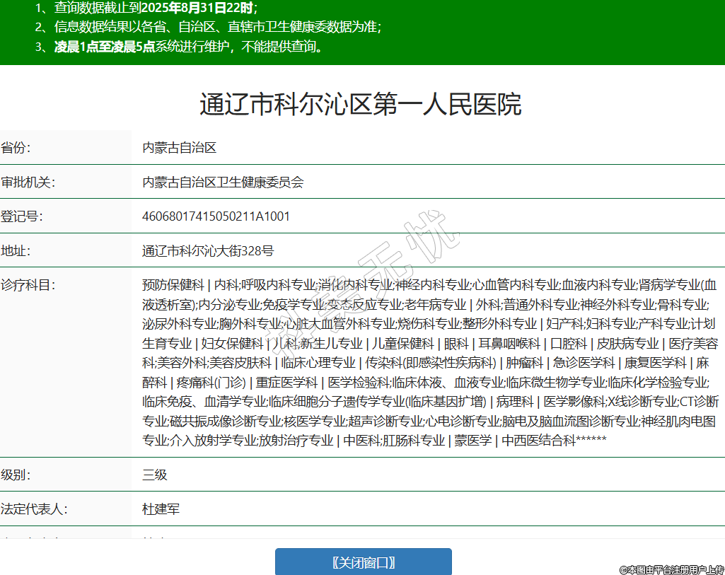 省份:內(nèi)蒙古自治區(qū)審批機(jī)關(guān):內(nèi)蒙古自治區(qū)衛(wèi)生健康委員會登記號:46068017415050211A1001地址:通遼市科爾沁大街328號診療科目:預(yù)防保健科 | 內(nèi)科;呼吸內(nèi)科專業(yè);消化內(nèi)科專業(yè);神經(jīng)內(nèi)科專業(yè);心血管內(nèi)科專業(yè);血液內(nèi)科專業(yè);腎病學(xué)專業(yè)(血液透析室);內(nèi)分泌專業(yè);免疫學(xué)專業(yè);變態(tài)反應(yīng)專業(yè);老年病專業(yè) | 外科;普通外科專業(yè);神經(jīng)外科專業(yè);骨科專業(yè);泌尿外科專業(yè);胸外科專業(yè);心臟大血管外科專業(yè);燒傷科專業(yè);整形外科專業(yè) | 婦產(chǎn)科;婦科專業(yè);產(chǎn)科專業(yè);計(jì)劃生育專業(yè) | 婦女保健科 | 兒科;新生兒專業(yè) | 兒童保健科 | 眼科 | 耳鼻咽喉科 | 口腔科 | 皮膚病專業(yè) | 醫(yī)療美容科;美容外科;美容皮膚科 | 臨床心理專業(yè) | 傳染科(即感染性疾病科) | 腫瘤科 | 急診醫(yī)學(xué)科 | 康復(fù)醫(yī)學(xué)科 | 麻醉科 | 疼痛科(門診) | 重癥醫(yī)學(xué)科 | 醫(yī)學(xué)檢驗(yàn)科;臨床體液、血液專業(yè);臨床微生物學(xué)專業(yè);臨床化學(xué)檢驗(yàn)專業(yè);臨床免疫、血清學(xué)專業(yè);臨床細(xì)胞分子遺傳學(xué)專業(yè)(臨床基因擴(kuò)增) | 病理科 | 醫(yī)學(xué)影像科;X線診斷專業(yè);CT診斷專業(yè);磁共振成像診斷專業(yè);核醫(yī)學(xué)專業(yè);超聲診斷專業(yè);心電診斷專業(yè);腦電及腦血流圖診斷專業(yè);神經(jīng)肌肉電圖專業(yè);介入放射學(xué)專業(yè);放射治療專業(yè) | 中醫(yī)科;肛腸科專業(yè) | 蒙醫(yī)學(xué) | 中西醫(yī)結(jié)合科******級別:三級法定代表人:杜建軍主要負(fù)責(zé)人:杜建軍執(zhí)業(yè)許可證有效期:2025/02/13 -至- 2039/12/15 -