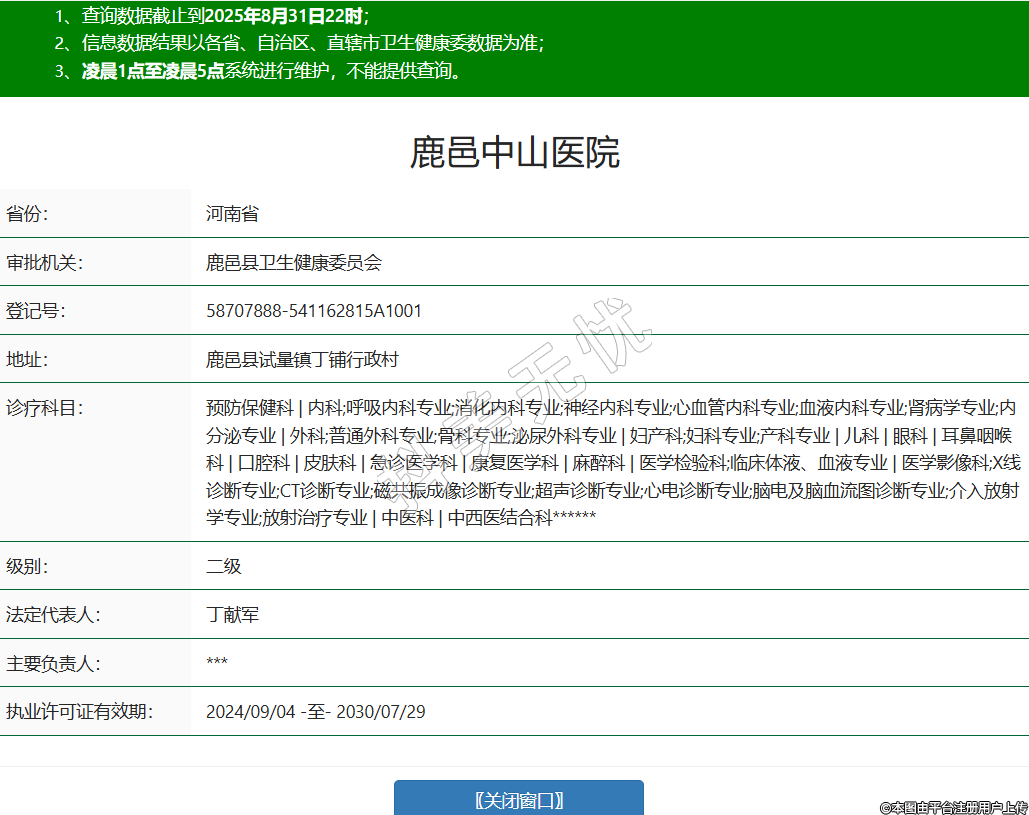 省份:河南省審批機(jī)關(guān):鹿邑縣衛(wèi)生健康委員會登記號:58707888-541162815A1001地址:鹿邑縣試量鎮(zhèn)丁鋪行政村診療科目:預(yù)防保健科 | 內(nèi)科;呼吸內(nèi)科專業(yè);消化內(nèi)科專業(yè);神經(jīng)內(nèi)科專業(yè);心血管內(nèi)科專業(yè);血液內(nèi)科專業(yè);腎病學(xué)專業(yè);內(nèi)分泌專業(yè) | 外科;普通外科專業(yè);骨科專業(yè);泌尿外科專業(yè) | 婦產(chǎn)科;婦科專業(yè);產(chǎn)科專業(yè) | 兒科 | 眼科 | 耳鼻咽喉科 | 口腔科 | 皮膚科 | 急診醫(yī)學(xué)科 | 康復(fù)醫(yī)學(xué)科 | 麻醉科 | 醫(yī)學(xué)檢驗科;臨床體液、血液專業(yè) | 醫(yī)學(xué)影像科;X線診斷專業(yè);CT診斷專業(yè);磁共振成像診斷專業(yè);超聲診斷專業(yè);心電診斷專業(yè);腦電及腦血流圖診斷專業(yè);介入放射學(xué)專業(yè);放射治療專業(yè) | 中醫(yī)科 | 中西醫(yī)結(jié)合科******級別:二級法定代表人:丁獻(xiàn)軍主要負(fù)責(zé)人:***執(zhí)業(yè)許可證有效期:2024/09/04 -至- 2030/07/29 -