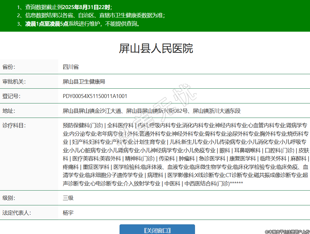 省份:四川省審批機(jī)關(guān):屏山縣衛(wèi)生健康局登記號:PDY00054X51150011A1001地址:屏山縣屏山鎮(zhèn)金沙江大道、屏山縣屏山鎮(zhèn)新興街082號、屏山鎮(zhèn)浙川大道東段診療科目:預(yù)防保健科(門診) | 全科醫(yī)療科 | 內(nèi)科;呼吸內(nèi)科專業(yè);消化內(nèi)科專業(yè);神經(jīng)內(nèi)科專業(yè);心血管內(nèi)科專業(yè);腎病學(xué)專業(yè);內(nèi)分泌專業(yè);老年病專業(yè) | 外科;普通外科專業(yè);神經(jīng)外科專業(yè);骨科專業(yè);泌尿外科專業(yè);胸外科專業(yè);燒傷科專業(yè) | 婦產(chǎn)科;婦科專業(yè);產(chǎn)科專業(yè);計劃生育專業(yè) | 兒科;新生兒專業(yè);小兒傳染病專業(yè);小兒消化專業(yè);小兒呼吸專業(yè);小兒心臟病專業(yè);小兒腎病專業(yè);小兒神經(jīng)病學(xué)專業(yè);小兒免疫專業(yè) | 眼科 | 耳鼻咽喉科 | 口腔科(門診) | 皮膚科 | 醫(yī)療美容科;美容外科 | 精神科(門診) | 傳染科 | 腫瘤科 | 急診醫(yī)學(xué)科 | 康復(fù)醫(yī)學(xué)科 | 臨終關(guān)懷科 | 麻醉科 | 疼痛科 | 重癥醫(yī)學(xué)科 | 醫(yī)學(xué)檢驗科;臨床體液、血液專業(yè);臨床微生物學(xué)專業(yè);臨床化學(xué)檢驗專業(yè);臨床免疫、血清學(xué)專業(yè);臨床細(xì)胞分子遺傳學(xué)專業(yè) | 病理科 | 醫(yī)學(xué)影像科;X線診斷專業(yè);CT診斷專業(yè);磁共振成像診斷專業(yè);超聲診斷專業(yè);心電診斷專業(yè);介入放射學(xué)專業(yè) | 中醫(yī)科 | 中西醫(yī)結(jié)合科(門診)******級別:三級法定代表人:楊宇主要負(fù)責(zé)人:楊宇執(zhí)業(yè)許可證有效期:2014/12/31 -至- 2029/12/30 -
