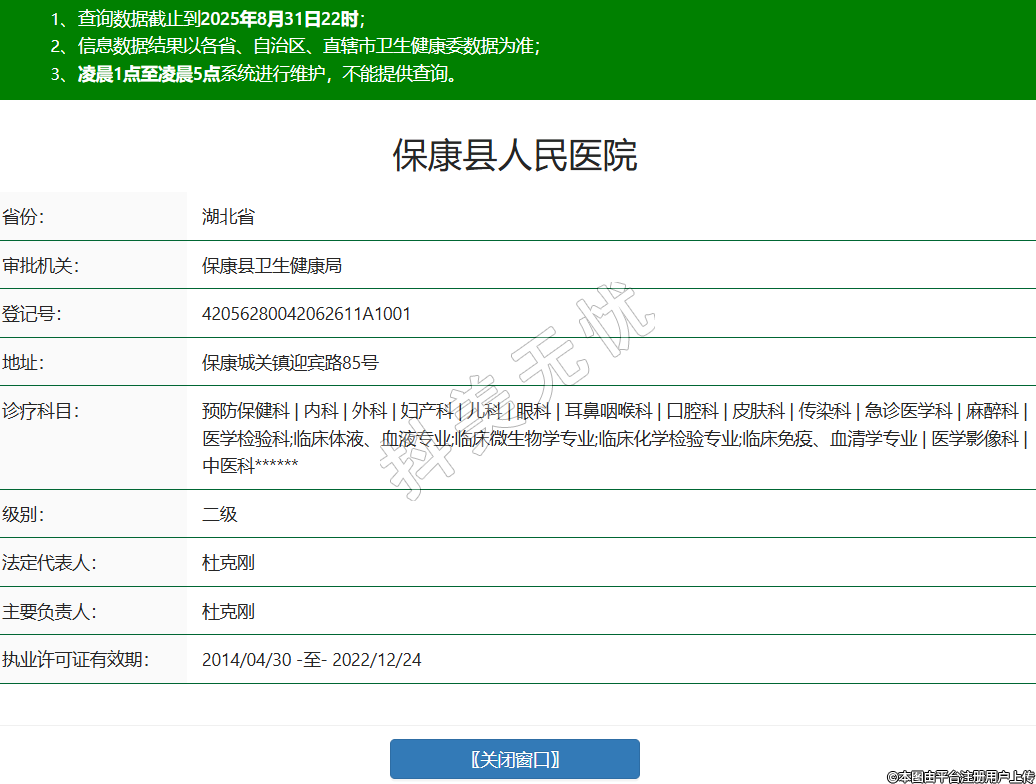 省份:湖北省審批機關(guān):??悼h衛(wèi)生健康局登記號:42056280042062611A1001地址:??党顷P(guān)鎮(zhèn)迎賓路85號診療科目:預(yù)防保健科 | 內(nèi)科 | 外科 | 婦產(chǎn)科 | 兒科 | 眼科 | 耳鼻咽喉科 | 口腔科 | 皮膚科 | 傳染科 | 急診醫(yī)學(xué)科 | 麻醉科 | 醫(yī)學(xué)檢驗科;臨床體液、血液專業(yè);臨床微生物學(xué)專業(yè);臨床化學(xué)檢驗專業(yè);臨床免疫、血清學(xué)專業(yè) | 醫(yī)學(xué)影像科 | 中醫(yī)科******級別:二級法定代表人:杜克剛主要負(fù)責(zé)人:杜克剛執(zhí)業(yè)許可證有效期:2014/04/30 -至- 2022/12/24 -