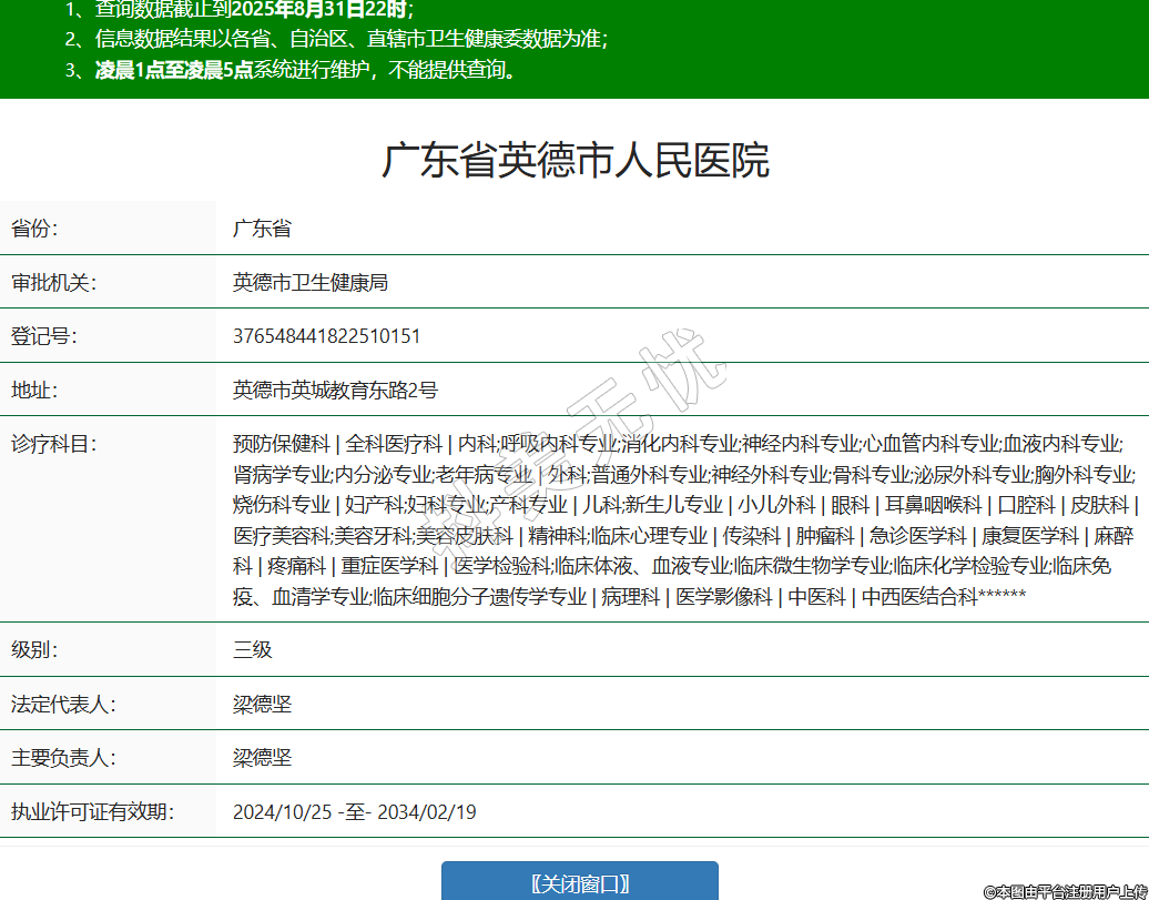 省份:廣東省審批機(jī)關(guān):英德市衛(wèi)生健康局登記號(hào):376548441822510151地址:英德市英城教育東路2號(hào)診療科目:預(yù)防保健科 | 全科醫(yī)療科 | 內(nèi)科;呼吸內(nèi)科專業(yè);消化內(nèi)科專業(yè);神經(jīng)內(nèi)科專業(yè);心血管內(nèi)科專業(yè);血液內(nèi)科專業(yè);腎病學(xué)專業(yè);內(nèi)分泌專業(yè);老年病專業(yè) | 外科;普通外科專業(yè);神經(jīng)外科專業(yè);骨科專業(yè);泌尿外科專業(yè);胸外科專業(yè);燒傷科專業(yè) | 婦產(chǎn)科;婦科專業(yè);產(chǎn)科專業(yè) | 兒科;新生兒專業(yè) | 小兒外科 | 眼科 | 耳鼻咽喉科 | 口腔科 | 皮膚科 | 醫(yī)療美容科;美容牙科;美容皮膚科 | 精神科;臨床心理專業(yè) | 傳染科 | 腫瘤科 | 急診醫(yī)學(xué)科 | 康復(fù)醫(yī)學(xué)科 | 麻醉科 | 疼痛科 | 重癥醫(yī)學(xué)科 | 醫(yī)學(xué)檢驗(yàn)科;臨床體液、血液專業(yè);臨床微生物學(xué)專業(yè);臨床化學(xué)檢驗(yàn)專業(yè);臨床免疫、血清學(xué)專業(yè);臨床細(xì)胞分子遺傳學(xué)專業(yè) | 病理科 | 醫(yī)學(xué)影像科 | 中醫(yī)科 | 中西醫(yī)結(jié)合科******級(jí)別:三級(jí)法定代表人:梁德堅(jiān)主要負(fù)責(zé)人:梁德堅(jiān)執(zhí)業(yè)許可證有效期:2024/10/25 -至- 2034/02/19 -
