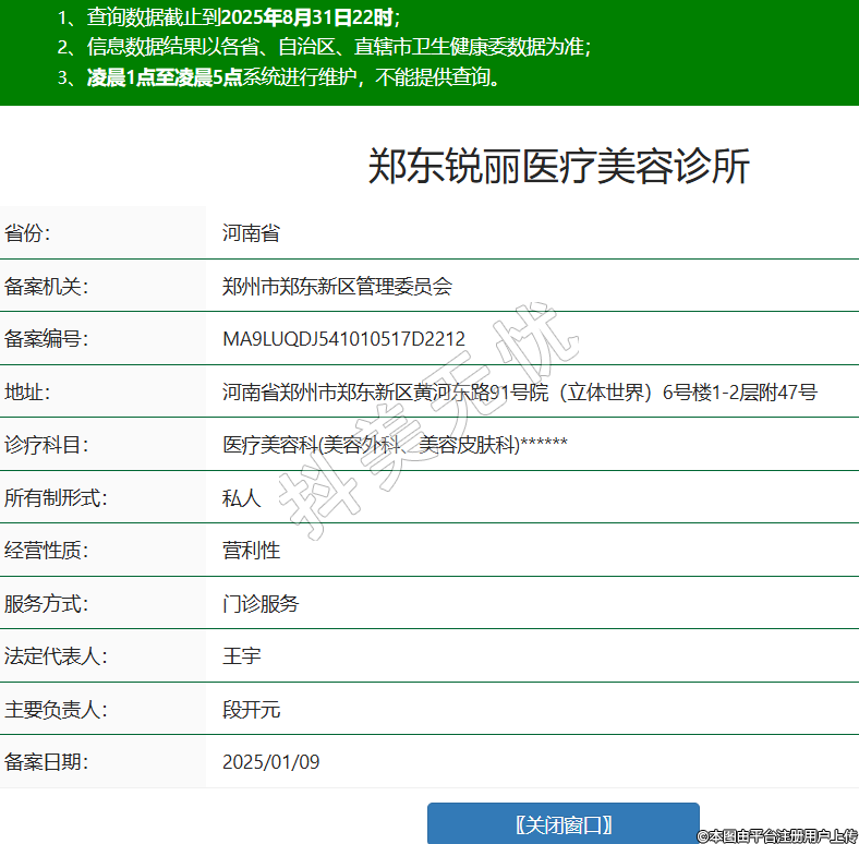 省份:河南省備案機(jī)關(guān):鄭州市鄭東新區(qū)管理委員會(huì)備案編號(hào):MA9LUQDJ541010517D2212地址:河南省鄭州市鄭東新區(qū)黃河?xùn)|路91號(hào)院(立體世界)6號(hào)樓1-2層附47號(hào)診療科目:醫(yī)療美容科(美容外科、美容皮膚科)******所有制形式:私人經(jīng)營(yíng)性質(zhì):營(yíng)利性服務(wù)方式:門(mén)診服務(wù)法定代表人:王宇主要負(fù)責(zé)人:段開(kāi)元備案日期:2025/01/09 -