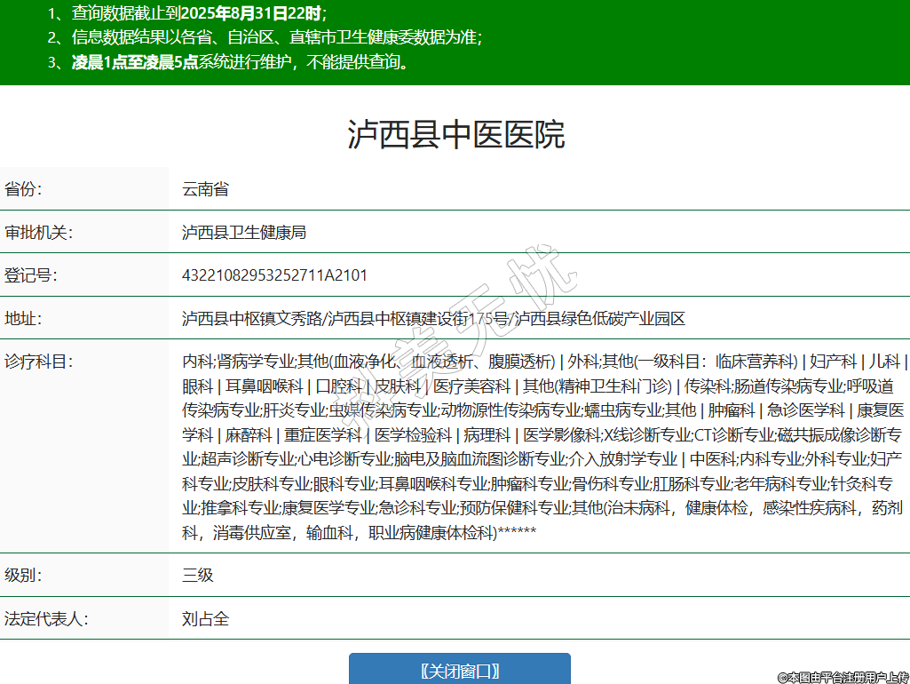 省份:云南省審批機(jī)關(guān):瀘西縣衛(wèi)生健康局登記號:43221082953252711A2101地址:瀘西縣中樞鎮(zhèn)文秀路/瀘西縣中樞鎮(zhèn)建設(shè)街175號/瀘西縣綠色低碳產(chǎn)業(yè)園區(qū)診療科目:內(nèi)科;腎病學(xué)專業(yè);其他(血液凈化、血液透析、腹膜透析) | 外科;其他(一級科目:臨床營養(yǎng)科) | 婦產(chǎn)科 | 兒科 | 眼科 | 耳鼻咽喉科 | 口腔科 | 皮膚科 | 醫(yī)療美容科 | 其他(精神衛(wèi)生科門診) | 傳染科;腸道傳染病專業(yè);呼吸道傳染病專業(yè);肝炎專業(yè);蟲媒傳染病專業(yè);動物源性傳染病專業(yè);蠕蟲病專業(yè);其他 | 腫瘤科 | 急診醫(yī)學(xué)科 | 康復(fù)醫(yī)學(xué)科 | 麻醉科 | 重癥醫(yī)學(xué)科 | 醫(yī)學(xué)檢驗(yàn)科 | 病理科 | 醫(yī)學(xué)影像科;X線診斷專業(yè);CT診斷專業(yè);磁共振成像診斷專業(yè);超聲診斷專業(yè);心電診斷專業(yè);腦電及腦血流圖診斷專業(yè);介入放射學(xué)專業(yè) | 中醫(yī)科;內(nèi)科專業(yè);外科專業(yè);婦產(chǎn)科專業(yè);皮膚科專業(yè);眼科專業(yè);耳鼻咽喉科專業(yè);腫瘤科專業(yè);骨傷科專業(yè);肛腸科專業(yè);老年病科專業(yè);針灸科專業(yè);推拿科專業(yè);康復(fù)醫(yī)學(xué)專業(yè);急診科專業(yè);預(yù)防保健科專業(yè);其他(治未病科,健康體檢,感染性疾病科,藥劑科,消毒供應(yīng)室,輸血科,職業(yè)病健康體檢科)******級別:三級法定代表人:劉占全主要負(fù)責(zé)人:劉占全執(zhí)業(yè)許可證有效期:2023/12/18 -至- 2038/12/18 -