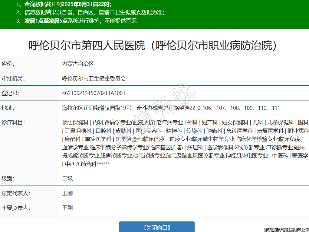 省份:內(nèi)蒙古自治區(qū)審批機關(guān):呼倫貝爾市衛(wèi)生健康委員會登記號:46210621315070211A1001地址:海拉爾區(qū)正陽街道陵園街19號、奮斗辦成吉思汗路望園22-0-106、107、108、109、110、111診療科目:預(yù)防保健科 | 內(nèi)科;腎病學(xué)專業(yè)(血液透析);老年病專業(yè) | 外科 | 婦產(chǎn)科 | 婦女保健科 | 兒科 | 兒童保健科 | 眼科 | 耳鼻咽喉科 | 口腔科 | 皮膚科 | 醫(yī)療美容科 | 精神科 | 傳染科 | 腫瘤科 | 急診醫(yī)學(xué)科 | 康復(fù)醫(yī)學(xué)科 | 職業(yè)病科 | 麻醉科 | 重癥醫(yī)學(xué)科 | 醫(yī)學(xué)檢驗科;臨床體液、血液專業(yè);臨床微生物學(xué)專業(yè);臨床化學(xué)檢驗專業(yè);臨床免疫、血清學(xué)專業(yè);臨床細胞分子遺傳學(xué)專業(yè)(臨床基因擴增) | 病理科 | 醫(yī)學(xué)影像科;X線診斷專業(yè);CT診斷專業(yè);磁共振成像診斷專業(yè);超聲診斷專業(yè);心電診斷專業(yè);腦電及腦血流圖診斷專業(yè);神經(jīng)肌肉電圖專業(yè) | 中醫(yī)科 | 蒙醫(yī)學(xué) | 中西醫(yī)結(jié)合科******級別:二級法定代表人:王剛主要負責(zé)人:王剛執(zhí)業(yè)許可證有效期:2024/02/06 -至- 2039/02/05 -