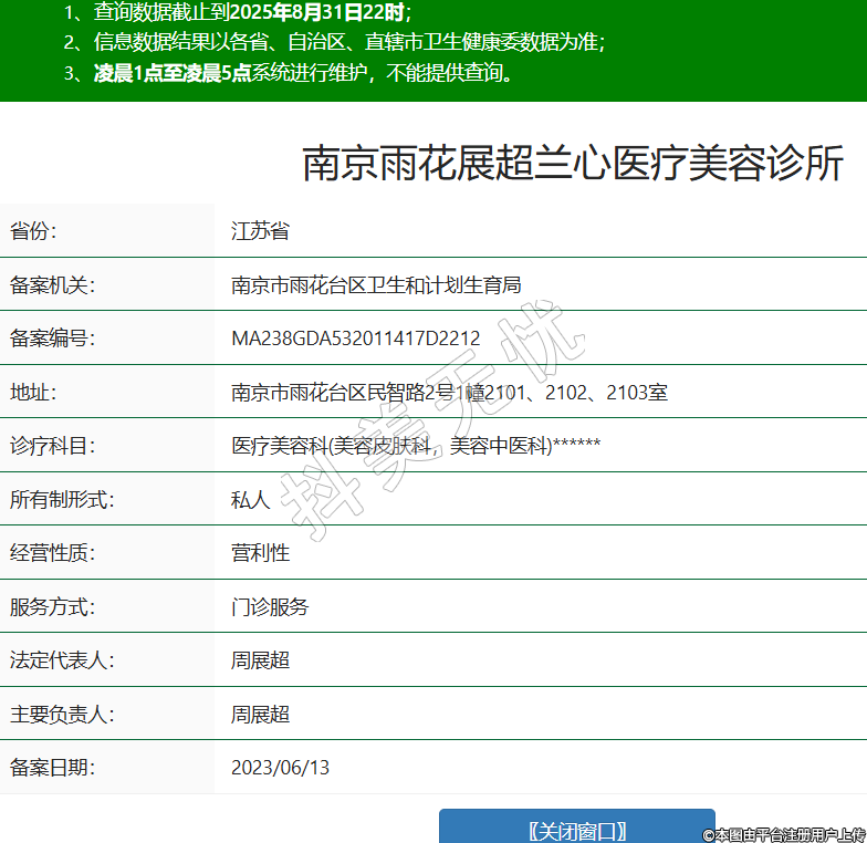 省份:江蘇省備案機(jī)關(guān):南京市雨花臺(tái)區(qū)衛(wèi)生和計(jì)劃生育局備案編號(hào):MA238GDA532011417D2212地址:南京市雨花臺(tái)區(qū)民智路2號(hào)1幢2101、2102、2103室診療科目:醫(yī)療美容科(美容皮膚科,美容中醫(yī)科)******所有制形式:私人經(jīng)營(yíng)性質(zhì):營(yíng)利性服務(wù)方式:門診服務(wù)法定代表人:周展超主要負(fù)責(zé)人:周展超備案日期:2023/06/13 -
