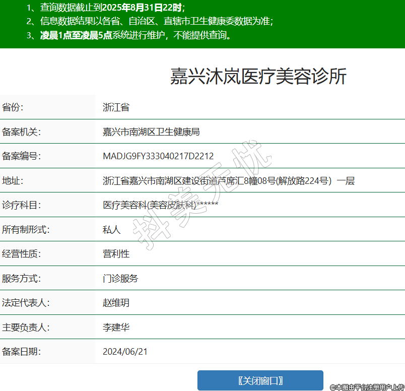 省份:浙江省備案機(jī)關(guān):嘉興市南湖區(qū)衛(wèi)生健康局備案編號(hào):MADJG9FY333040217D2212地址:浙江省嘉興市南湖區(qū)建設(shè)街道蘆席匯8幢08號(hào)(解放路224號(hào))一層診療科目:醫(yī)療美容科(美容皮膚科)******所有制形式:私人經(jīng)營性質(zhì):營利性服務(wù)方式:門診服務(wù)法定代表人:趙維玥主要負(fù)責(zé)人:李建華備案日期:2024/06/21 -