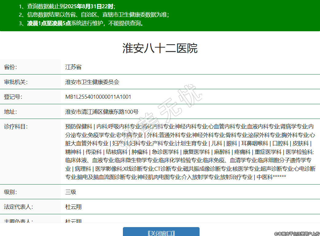 省份:江蘇省審批機關(guān):淮安市衛(wèi)生健康委員會登記號:MB1L2554010000011A1001地址:淮安市清江浦區(qū)健康東路100號診療科目:預(yù)防保健科 | 內(nèi)科;呼吸內(nèi)科專業(yè);消化內(nèi)科專業(yè);神經(jīng)內(nèi)科專業(yè);心血管內(nèi)科專業(yè);血液內(nèi)科專業(yè);腎病學(xué)專業(yè);內(nèi)分泌專業(yè);免疫學(xué)專業(yè);老年病專業(yè) | 外科;普通外科專業(yè);神經(jīng)外科專業(yè);骨科專業(yè);泌尿外科專業(yè);胸外科專業(yè);心臟大血管外科專業(yè) | 婦產(chǎn)科;婦科專業(yè);產(chǎn)科專業(yè);計劃生育專業(yè) | 兒科 | 眼科 | 耳鼻咽喉科 | 口腔科 | 皮膚科 | 精神科 | 傳染科 | 結(jié)核病科 | 腫瘤科 | 急診醫(yī)學(xué)科 | 康復(fù)醫(yī)學(xué)科 | 麻醉科 | 疼痛科 | 重癥醫(yī)學(xué)科 | 醫(yī)學(xué)檢驗科;臨床體液、血液專業(yè);臨床微生物學(xué)專業(yè);臨床化學(xué)檢驗專業(yè);臨床免疫、血清學(xué)專業(yè);臨床細胞分子遺傳學(xué)專業(yè) | 病理科 | 醫(yī)學(xué)影像科;X線診斷專業(yè);CT診斷專業(yè);磁共振成像診斷專業(yè);核醫(yī)學(xué)專業(yè);超聲診斷專業(yè);心電診斷專業(yè);腦電及腦血流圖診斷專業(yè);神經(jīng)肌肉電圖專業(yè);介入放射學(xué)專業(yè);放射治療專業(yè) | 中醫(yī)科******級別:三級法定代表人:杜云翔主要負責(zé)人:杜云翔執(zhí)業(yè)許可證有效期:2025/04/01 -至- 2038/03/05 -