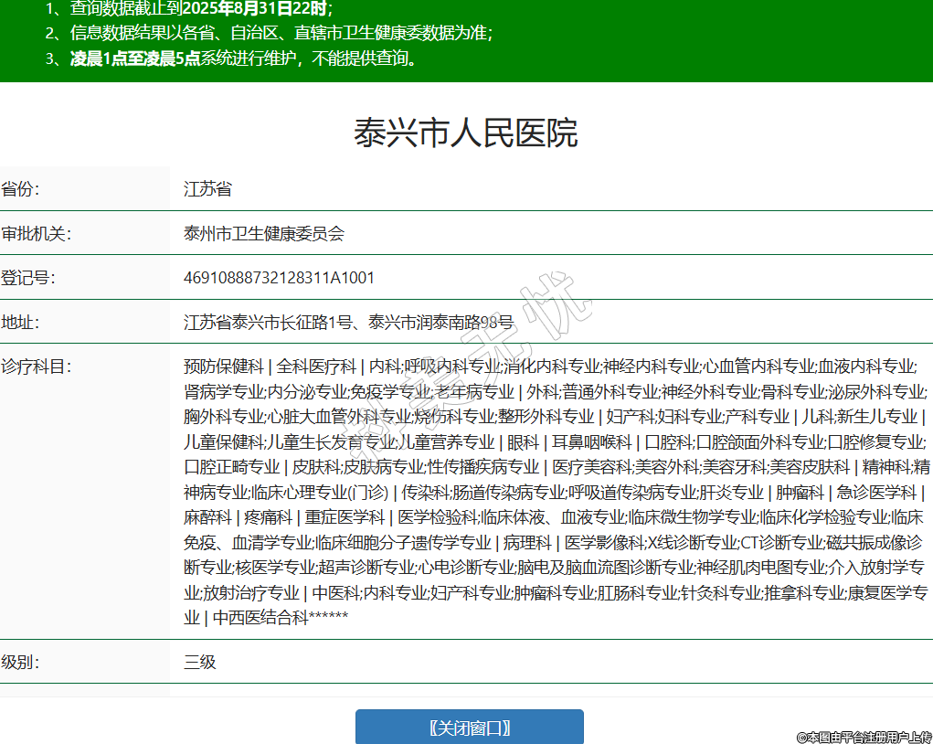 省份:江蘇省審批機(jī)關(guān):泰州市衛(wèi)生健康委員會(huì)登記號(hào):46910888732128311A1001地址:江蘇省泰興市長征路1號(hào)、泰興市潤泰南路98號(hào)診療科目:預(yù)防保健科 | 全科醫(yī)療科 | 內(nèi)科;呼吸內(nèi)科專業(yè);消化內(nèi)科專業(yè);神經(jīng)內(nèi)科專業(yè);心血管內(nèi)科專業(yè);血液內(nèi)科專業(yè);腎病學(xué)專業(yè);內(nèi)分泌專業(yè);免疫學(xué)專業(yè);老年病專業(yè) | 外科;普通外科專業(yè);神經(jīng)外科專業(yè);骨科專業(yè);泌尿外科專業(yè);胸外科專業(yè);心臟大血管外科專業(yè);燒傷科專業(yè);整形外科專業(yè) | 婦產(chǎn)科;婦科專業(yè);產(chǎn)科專業(yè) | 兒科;新生兒專業(yè) | 兒童保健科;兒童生長發(fā)育專業(yè);兒童營養(yǎng)專業(yè) | 眼科 | 耳鼻咽喉科 | 口腔科;口腔頜面外科專業(yè);口腔修復(fù)專業(yè);口腔正畸專業(yè) | 皮膚科;皮膚病專業(yè);性傳播疾病專業(yè) | 醫(yī)療美容科;美容外科;美容牙科;美容皮膚科 | 精神科;精神病專業(yè);臨床心理專業(yè)(門診) | 傳染科;腸道傳染病專業(yè);呼吸道傳染病專業(yè);肝炎專業(yè) | 腫瘤科 | 急診醫(yī)學(xué)科 | 麻醉科 | 疼痛科 | 重癥醫(yī)學(xué)科 | 醫(yī)學(xué)檢驗(yàn)科;臨床體液、血液專業(yè);臨床微生物學(xué)專業(yè);臨床化學(xué)檢驗(yàn)專業(yè);臨床免疫、血清學(xué)專業(yè);臨床細(xì)胞分子遺傳學(xué)專業(yè) | 病理科 | 醫(yī)學(xué)影像科;X線診斷專業(yè);CT診斷專業(yè);磁共振成像診斷專業(yè);核醫(yī)學(xué)專業(yè);超聲診斷專業(yè);心電診斷專業(yè);腦電及腦血流圖診斷專業(yè);神經(jīng)肌肉電圖專業(yè);介入放射學(xué)專業(yè);放射治療專業(yè) | 中醫(yī)科;內(nèi)科專業(yè);婦產(chǎn)科專業(yè);腫瘤科專業(yè);肛腸科專業(yè);針灸科專業(yè);推拿科專業(yè);康復(fù)醫(yī)學(xué)專業(yè) | 中西醫(yī)結(jié)合科******級(jí)別:三級(jí)法定代表人:李文江主要負(fù)責(zé)人:李文江執(zhí)業(yè)許可證有效期:2021/03/31 -至- 2036/03/30 -