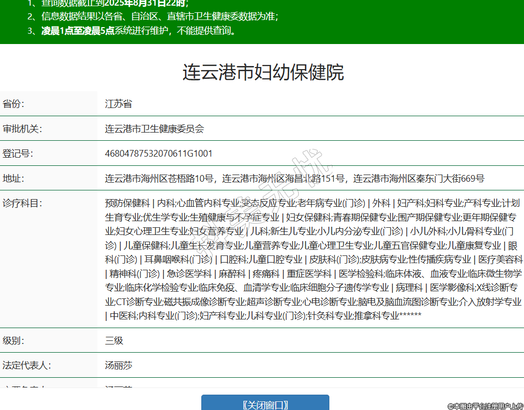 省份:江蘇省審批機(jī)關(guān):連云港市衛(wèi)生健康委員會(huì)登記號(hào):46804787532070611G1001地址:連云港市海州區(qū)蒼梧路10號(hào),連云港市海州區(qū)海昌北路151號(hào),連云港市海州區(qū)秦東門大街669號(hào)診療科目:預(yù)防保健科 | 內(nèi)科;心血管內(nèi)科專業(yè);變態(tài)反應(yīng)專業(yè);老年病專業(yè)(門診) | 外科 | 婦產(chǎn)科;婦科專業(yè);產(chǎn)科專業(yè);計(jì)劃生育專業(yè);優(yōu)生學(xué)專業(yè);生殖健康與不孕癥專業(yè) | 婦女保健科;青春期保健專業(yè);圍產(chǎn)期保健專業(yè);更年期保健專業(yè);婦女心理衛(wèi)生專業(yè);婦女營養(yǎng)專業(yè) | 兒科;新生兒專業(yè);小兒內(nèi)分泌專業(yè)(門診) | 小兒外科;小兒骨科專業(yè)(門診) | 兒童保健科;兒童生長發(fā)育專業(yè);兒童營養(yǎng)專業(yè);兒童心理衛(wèi)生專業(yè);兒童五官保健專業(yè);兒童康復(fù)專業(yè) | 眼科(門診) | 耳鼻咽喉科(門診) | 口腔科;兒童口腔專業(yè) | 皮膚科(門診);皮膚病專業(yè);性傳播疾病專業(yè) | 醫(yī)療美容科 | 精神科(門診) | 急診醫(yī)學(xué)科 | 麻醉科 | 疼痛科 | 重癥醫(yī)學(xué)科 | 醫(yī)學(xué)檢驗(yàn)科;臨床體液、血液專業(yè);臨床微生物學(xué)專業(yè);臨床化學(xué)檢驗(yàn)專業(yè);臨床免疫、血清學(xué)專業(yè);臨床細(xì)胞分子遺傳學(xué)專業(yè) | 病理科 | 醫(yī)學(xué)影像科;X線診斷專業(yè);CT診斷專業(yè);磁共振成像診斷專業(yè);超聲診斷專業(yè);心電診斷專業(yè);腦電及腦血流圖診斷專業(yè);介入放射學(xué)專業(yè) | 中醫(yī)科;內(nèi)科專業(yè)(門診);婦產(chǎn)科專業(yè);兒科專業(yè)(門診);針灸科專業(yè);推拿科專業(yè)******級(jí)別:三級(jí)法定代表人:湯麗莎主要負(fù)責(zé)人:湯麗莎執(zhí)業(yè)許可證有效期:2021/12/30 -至- 2036/12/30 -