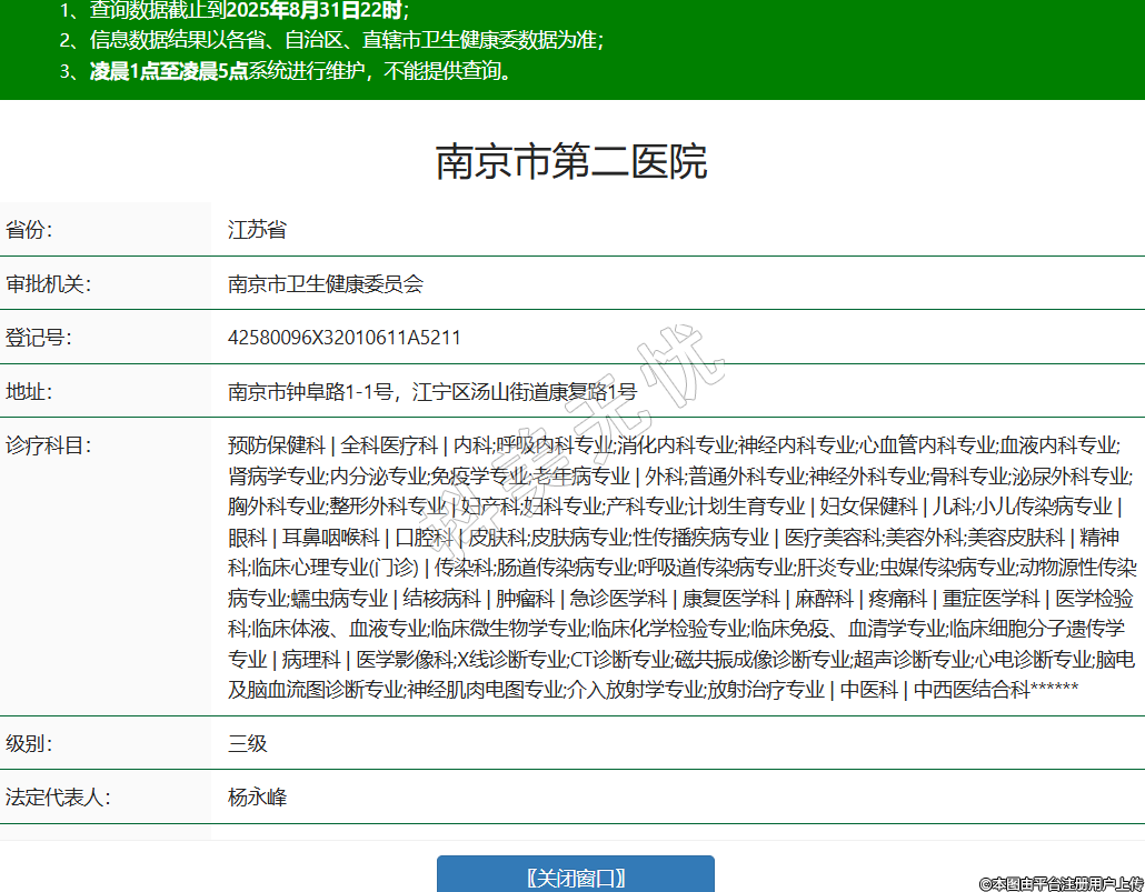 省份:江蘇省審批機關(guān):南京市衛(wèi)生健康委員會登記號:42580096X32010611A5211地址:南京市鐘阜路1-1號,江寧區(qū)湯山街道康復(fù)路1號診療科目:預(yù)防保健科 | 全科醫(yī)療科 | 內(nèi)科;呼吸內(nèi)科專業(yè);消化內(nèi)科專業(yè);神經(jīng)內(nèi)科專業(yè);心血管內(nèi)科專業(yè);血液內(nèi)科專業(yè);腎病學(xué)專業(yè);內(nèi)分泌專業(yè);免疫學(xué)專業(yè);老年病專業(yè) | 外科;普通外科專業(yè);神經(jīng)外科專業(yè);骨科專業(yè);泌尿外科專業(yè);胸外科專業(yè);整形外科專業(yè) | 婦產(chǎn)科;婦科專業(yè);產(chǎn)科專業(yè);計劃生育專業(yè) | 婦女保健科 | 兒科;小兒傳染病專業(yè) | 眼科 | 耳鼻咽喉科 | 口腔科 | 皮膚科;皮膚病專業(yè);性傳播疾病專業(yè) | 醫(yī)療美容科;美容外科;美容皮膚科 | 精神科;臨床心理專業(yè)(門診) | 傳染科;腸道傳染病專業(yè);呼吸道傳染病專業(yè);肝炎專業(yè);蟲媒傳染病專業(yè);動物源性傳染病專業(yè);蠕蟲病專業(yè) | 結(jié)核病科 | 腫瘤科 | 急診醫(yī)學(xué)科 | 康復(fù)醫(yī)學(xué)科 | 麻醉科 | 疼痛科 | 重癥醫(yī)學(xué)科 | 醫(yī)學(xué)檢驗科;臨床體液、血液專業(yè);臨床微生物學(xué)專業(yè);臨床化學(xué)檢驗專業(yè);臨床免疫、血清學(xué)專業(yè);臨床細胞分子遺傳學(xué)專業(yè) | 病理科 | 醫(yī)學(xué)影像科;X線診斷專業(yè);CT診斷專業(yè);磁共振成像診斷專業(yè);超聲診斷專業(yè);心電診斷專業(yè);腦電及腦血流圖診斷專業(yè);神經(jīng)肌肉電圖專業(yè);介入放射學(xué)專業(yè);放射治療專業(yè) | 中醫(yī)科 | 中西醫(yī)結(jié)合科******級別:三級法定代表人:楊永峰主要負責人:楊永峰執(zhí)業(yè)許可證有效期:2025/04/17 -至- 2035/09/22 -