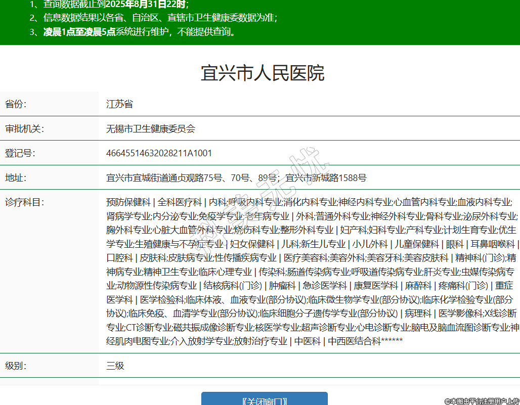 省份:江蘇省審批機(jī)關(guān):無錫市衛(wèi)生健康委員會(huì)登記號(hào):46645514632028211A1001地址:宜興市宜城街道通貞觀路75號(hào)、70號(hào)、89號(hào);宜興市新城路1588號(hào)診療科目:預(yù)防保健科 | 全科醫(yī)療科 | 內(nèi)科;呼吸內(nèi)科專業(yè);消化內(nèi)科專業(yè);神經(jīng)內(nèi)科專業(yè);心血管內(nèi)科專業(yè);血液內(nèi)科專業(yè);腎病學(xué)專業(yè);內(nèi)分泌專業(yè);免疫學(xué)專業(yè);老年病專業(yè) | 外科;普通外科專業(yè);神經(jīng)外科專業(yè);骨科專業(yè);泌尿外科專業(yè);胸外科專業(yè);心臟大血管外科專業(yè);燒傷科專業(yè);整形外科專業(yè) | 婦產(chǎn)科;婦科專業(yè);產(chǎn)科專業(yè);計(jì)劃生育專業(yè);優(yōu)生學(xué)專業(yè);生殖健康與不孕癥專業(yè) | 婦女保健科 | 兒科;新生兒專業(yè) | 小兒外科 | 兒童保健科 | 眼科 | 耳鼻咽喉科 | 口腔科 | 皮膚科;皮膚病專業(yè);性傳播疾病專業(yè) | 醫(yī)療美容科;美容外科;美容牙科;美容皮膚科 | 精神科(門診);精神病專業(yè);精神衛(wèi)生專業(yè);臨床心理專業(yè) | 傳染科;腸道傳染病專業(yè);呼吸道傳染病專業(yè);肝炎專業(yè);蟲媒傳染病專業(yè);動(dòng)物源性傳染病專業(yè) | 結(jié)核病科(門診) | 腫瘤科 | 急診醫(yī)學(xué)科 | 康復(fù)醫(yī)學(xué)科 | 麻醉科 | 疼痛科(門診) | 重癥醫(yī)學(xué)科 | 醫(yī)學(xué)檢驗(yàn)科;臨床體液、血液專業(yè)(部分協(xié)議);臨床微生物學(xué)專業(yè)(部分協(xié)議);臨床化學(xué)檢驗(yàn)專業(yè)(部分協(xié)議);臨床免疫、血清學(xué)專業(yè)(部分協(xié)議);臨床細(xì)胞分子遺傳學(xué)專業(yè)(部分協(xié)議) | 病理科 | 醫(yī)學(xué)影像科;X線診斷專業(yè);CT診斷專業(yè);磁共振成像診斷專業(yè);核醫(yī)學(xué)專業(yè);超聲診斷專業(yè);心電診斷專業(yè);腦電及腦血流圖診斷專業(yè);神經(jīng)肌肉電圖專業(yè);介入放射學(xué)專業(yè);放射治療專業(yè) | 中醫(yī)科 | 中西醫(yī)結(jié)合科******級(jí)別:三級(jí)法定代表人:吳俊東主要負(fù)責(zé)人:吳俊東執(zhí)業(yè)許可證有效期:2021/12/19 -至- 2036/12/18 -