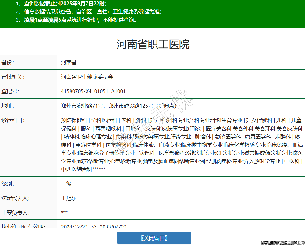 省份:河南省審批機(jī)關(guān):河南省衛(wèi)生健康委員會登記號:41580705-X41010511A1001地址:鄭州市農(nóng)業(yè)路71號,鄭州市建設(shè)路125號(延伸點)診療科目:預(yù)防保健科 | 全科醫(yī)療科 | 內(nèi)科 | 外科 | 婦產(chǎn)科;婦科專業(yè);產(chǎn)科專業(yè);計劃生育專業(yè) | 婦女保健科 | 兒科 | 兒童保健科 | 眼科 | 耳鼻咽喉科 | 口腔科 | 皮膚科;皮膚病專業(yè)(門診) | 醫(yī)療美容科;美容外科;美容牙科;美容皮膚科 | 精神科;臨床心理專業(yè) | 傳染科;腸道傳染病專業(yè);肝炎專業(yè) | 腫瘤科 | 急診醫(yī)學(xué)科 | 康復(fù)醫(yī)學(xué)科 | 麻醉科 | 疼痛科 | 重癥醫(yī)學(xué)科 | 醫(yī)學(xué)檢驗科;臨床體液、血液專業(yè);臨床微生物學(xué)專業(yè);臨床化學(xué)檢驗專業(yè);臨床免疫、血清學(xué)專業(yè);臨床細(xì)胞分子遺傳學(xué)專業(yè) | 病理科 | 醫(yī)學(xué)影像科;X線診斷專業(yè);CT診斷專業(yè);磁共振成像診斷專業(yè);核醫(yī)學(xué)專業(yè);超聲診斷專業(yè);心電診斷專業(yè);腦電及腦血流圖診斷專業(yè);神經(jīng)肌肉電圖專業(yè);介入放射學(xué)專業(yè) | 中醫(yī)科 | 中西醫(yī)結(jié)合科******級別:三級法定代表人:王旭東主要負(fù)責(zé)人:***執(zhí)業(yè)許可證有效期:2024/12/23 -至- 2033/04/09 -