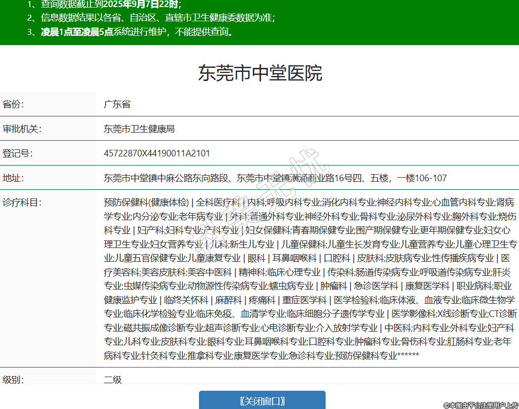 省份:廣東省審批機(jī)關(guān):東莞市衛(wèi)生健康局登記號(hào):45722870X44190011A2101地址:東莞市中堂鎮(zhèn)中麻公路東向路段、東莞市中堂鎮(zhèn)潢涌商業(yè)路16號(hào)四、五樓,一樓106-107診療科目:預(yù)防保健科(健康體檢) | 全科醫(yī)療科 | 內(nèi)科;呼吸內(nèi)科專業(yè);消化內(nèi)科專業(yè);神經(jīng)內(nèi)科專業(yè);心血管內(nèi)科專業(yè);腎病學(xué)專業(yè);內(nèi)分泌專業(yè);老年病專業(yè) | 外科;普通外科專業(yè);神經(jīng)外科專業(yè);骨科專業(yè);泌尿外科專業(yè);胸外科專業(yè);燒傷科專業(yè) | 婦產(chǎn)科;婦科專業(yè);產(chǎn)科專業(yè) | 婦女保健科;青春期保健專業(yè);圍產(chǎn)期保健專業(yè);更年期保健專業(yè);婦女心理衛(wèi)生專業(yè);婦女營(yíng)養(yǎng)專業(yè) | 兒科;新生兒專業(yè) | 兒童保健科;兒童生長(zhǎng)發(fā)育專業(yè);兒童營(yíng)養(yǎng)專業(yè);兒童心理衛(wèi)生專業(yè);兒童五官保健專業(yè);兒童康復(fù)專業(yè) | 眼科 | 耳鼻咽喉科 | 口腔科 | 皮膚科;皮膚病專業(yè);性傳播疾病專業(yè) | 醫(yī)療美容科;美容皮膚科;美容中醫(yī)科 | 精神科;臨床心理專業(yè) | 傳染科;腸道傳染病專業(yè);呼吸道傳染病專業(yè);肝炎專業(yè);蟲媒傳染病專業(yè);動(dòng)物源性傳染病專業(yè);蠕蟲病專業(yè) | 腫瘤科 | 急診醫(yī)學(xué)科 | 康復(fù)醫(yī)學(xué)科 | 職業(yè)病科;職業(yè)健康監(jiān)護(hù)專業(yè) | 臨終關(guān)懷科 | 麻醉科 | 疼痛科 | 重癥醫(yī)學(xué)科 | 醫(yī)學(xué)檢驗(yàn)科;臨床體液、血液專業(yè);臨床微生物學(xué)專業(yè);臨床化學(xué)檢驗(yàn)專業(yè);臨床免疫、血清學(xué)專業(yè);臨床細(xì)胞分子遺傳學(xué)專業(yè) | 醫(yī)學(xué)影像科;X線診斷專業(yè);CT診斷專業(yè);磁共振成像診斷專業(yè);超聲診斷專業(yè);心電診斷專業(yè);介入放射學(xué)專業(yè) | 中醫(yī)科;內(nèi)科專業(yè);外科專業(yè);婦產(chǎn)科專業(yè);兒科專業(yè);皮膚科專業(yè);眼科專業(yè);耳鼻咽喉科專業(yè);口腔科專業(yè);腫瘤科專業(yè);骨傷科專業(yè);肛腸科專業(yè);老年病科專業(yè);針灸科專業(yè);推拿科專業(yè);康復(fù)醫(yī)學(xué)專業(yè);急診科專業(yè);預(yù)防保健科專業(yè)******級(jí)別:二級(jí)法定代表人:黎銳波主要負(fù)責(zé)人:黎銳波執(zhí)業(yè)許可證有效期:2025/02/26 -至- 2039/12/13 -