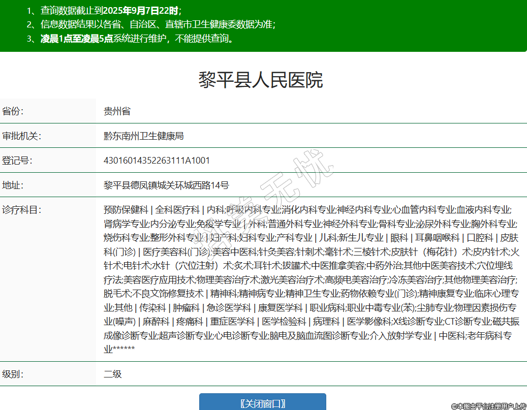 省份:貴州省審批機關(guān):黔東南州衛(wèi)生健康局登記號:43016014352263111A1001地址:黎平縣德鳳鎮(zhèn)城關(guān)環(huán)城西路14號診療科目:預防保健科 | 全科醫(yī)療科 | 內(nèi)科;呼吸內(nèi)科專業(yè);消化內(nèi)科專業(yè);神經(jīng)內(nèi)科專業(yè);心血管內(nèi)科專業(yè);血液內(nèi)科專業(yè);腎病學專業(yè);內(nèi)分泌專業(yè);免疫學專業(yè) | 外科;普通外科專業(yè);神經(jīng)外科專業(yè);骨科專業(yè);泌尿外科專業(yè);胸外科專業(yè);燒傷科專業(yè);整形外科專業(yè) | 婦產(chǎn)科;婦科專業(yè);產(chǎn)科專業(yè) | 兒科;新生兒專業(yè) | 眼科 | 耳鼻咽喉科 | 口腔科 | 皮膚科(門診) | 醫(yī)療美容科(門診);美容中醫(yī)科;針灸美容;針刺術(shù);毫針術(shù);三棱針術(shù);皮膚針(梅花針)術(shù);皮內(nèi)針術(shù);火針術(shù);電針術(shù);水針(穴位注射)術(shù);炙術(shù);耳針術(shù);拔罐術(shù);中醫(yī)推拿美容;中藥外治;其他中醫(yī)美容技術(shù);穴位埋線療法;美容醫(yī)療應用技術(shù);物理美容治療術(shù);激光美容治療術(shù);高頻電美容治療;冷凍美容治療;其他物理美容治療;脫毛術(shù);不良文飾修復技術(shù) | 精神科;精神病專業(yè);精神衛(wèi)生專業(yè);藥物依賴專業(yè)(門診);精神康復專業(yè);臨床心理專業(yè);其他 | 傳染科 | 腫瘤科 | 急診醫(yī)學科 | 康復醫(yī)學科 | 職業(yè)病科;職業(yè)中毒專業(yè)(苯);塵肺專業(yè);物理因素損傷專業(yè)(噪聲) | 麻醉科 | 疼痛科 | 重癥醫(yī)學科 | 醫(yī)學檢驗科 | 病理科 | 醫(yī)學影像科;X線診斷專業(yè);CT診斷專業(yè);磁共振成像診斷專業(yè);超聲診斷專業(yè);心電診斷專業(yè);腦電及腦血流圖診斷專業(yè);介入放射學專業(yè) | 中醫(yī)科;老年病科專業(yè)******級別:二級法定代表人:李勇主要負責人:李勇執(zhí)業(yè)許可證有效期:2025/05/12 -至- 2040/05/11 -