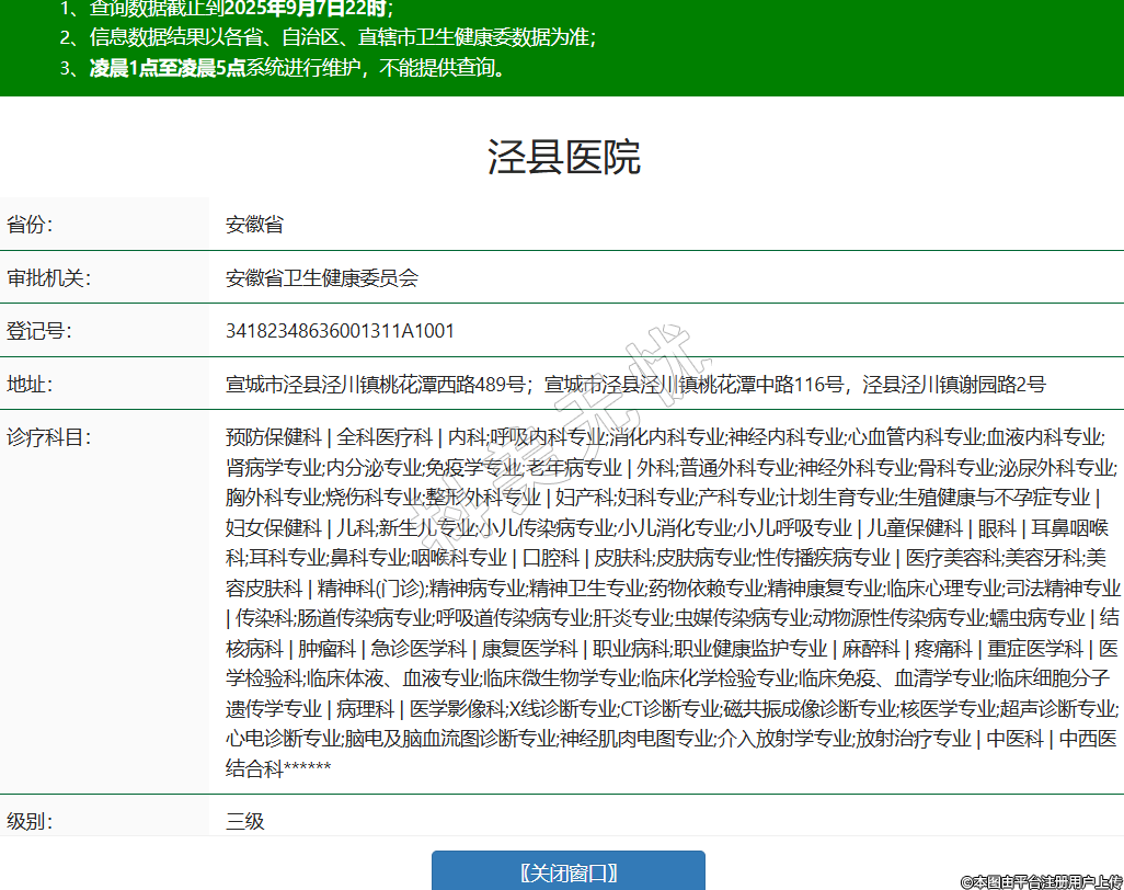 省份:安徽省審批機關(guān):安徽省衛(wèi)生健康委員會登記號:34182348636001311A1001地址:宣城市涇縣涇川鎮(zhèn)桃花潭西路489號;宣城市涇縣涇川鎮(zhèn)桃花潭中路116號,涇縣涇川鎮(zhèn)謝園路2號診療科目:預(yù)防保健科 | 全科醫(yī)療科 | 內(nèi)科;呼吸內(nèi)科專業(yè);消化內(nèi)科專業(yè);神經(jīng)內(nèi)科專業(yè);心血管內(nèi)科專業(yè);血液內(nèi)科專業(yè);腎病學(xué)專業(yè);內(nèi)分泌專業(yè);免疫學(xué)專業(yè);老年病專業(yè) | 外科;普通外科專業(yè);神經(jīng)外科專業(yè);骨科專業(yè);泌尿外科專業(yè);胸外科專業(yè);燒傷科專業(yè);整形外科專業(yè) | 婦產(chǎn)科;婦科專業(yè);產(chǎn)科專業(yè);計劃生育專業(yè);生殖健康與不孕癥專業(yè) | 婦女保健科 | 兒科;新生兒專業(yè);小兒傳染病專業(yè);小兒消化專業(yè);小兒呼吸專業(yè) | 兒童保健科 | 眼科 | 耳鼻咽喉科;耳科專業(yè);鼻科專業(yè);咽喉科專業(yè) | 口腔科 | 皮膚科;皮膚病專業(yè);性傳播疾病專業(yè) | 醫(yī)療美容科;美容牙科;美容皮膚科 | 精神科(門診);精神病專業(yè);精神衛(wèi)生專業(yè);藥物依賴專業(yè);精神康復(fù)專業(yè);臨床心理專業(yè);司法精神專業(yè) | 傳染科;腸道傳染病專業(yè);呼吸道傳染病專業(yè);肝炎專業(yè);蟲媒傳染病專業(yè);動物源性傳染病專業(yè);蠕蟲病專業(yè) | 結(jié)核病科 | 腫瘤科 | 急診醫(yī)學(xué)科 | 康復(fù)醫(yī)學(xué)科 | 職業(yè)病科;職業(yè)健康監(jiān)護(hù)專業(yè) | 麻醉科 | 疼痛科 | 重癥醫(yī)學(xué)科 | 醫(yī)學(xué)檢驗科;臨床體液、血液專業(yè);臨床微生物學(xué)專業(yè);臨床化學(xué)檢驗專業(yè);臨床免疫、血清學(xué)專業(yè);臨床細(xì)胞分子遺傳學(xué)專業(yè) | 病理科 | 醫(yī)學(xué)影像科;X線診斷專業(yè);CT診斷專業(yè);磁共振成像診斷專業(yè);核醫(yī)學(xué)專業(yè);超聲診斷專業(yè);心電診斷專業(yè);腦電及腦血流圖診斷專業(yè);神經(jīng)肌肉電圖專業(yè);介入放射學(xué)專業(yè);放射治療專業(yè) | 中醫(yī)科 | 中西醫(yī)結(jié)合科******級別:三級法定代表人:潘志剛主要負(fù)責(zé)人:潘志剛執(zhí)業(yè)許可證有效期:2023/11/17 -至- 2035/11/11 -