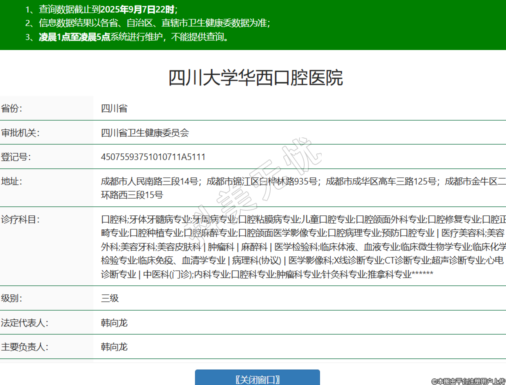 省份:四川省審批機關:四川省衛(wèi)生健康委員會登記號:45075593751010711A5111地址:成都市人民南路三段14號;成都市錦江區(qū)白樺林路935號;成都市成華區(qū)高車三路125號;成都市金牛區(qū)二環(huán)路西三段15號診療科目:口腔科;牙體牙髓病專業(yè);牙周病專業(yè);口腔粘膜病專業(yè);兒童口腔專業(yè);口腔頜面外科專業(yè);口腔修復專業(yè);口腔正畸專業(yè);口腔種植專業(yè);口腔麻醉專業(yè);口腔頜面醫(yī)學影像專業(yè);口腔病理專業(yè);預防口腔專業(yè) | 醫(yī)療美容科;美容外科;美容牙科;美容皮膚科 | 腫瘤科 | 麻醉科 | 醫(yī)學檢驗科;臨床體液、血液專業(yè);臨床微生物學專業(yè);臨床化學檢驗專業(yè);臨床免疫、血清學專業(yè) | 病理科(協(xié)議) | 醫(yī)學影像科;X線診斷專業(yè);CT診斷專業(yè);超聲診斷專業(yè);心電診斷專業(yè) | 中醫(yī)科(門診);內科專業(yè);口腔科專業(yè);腫瘤科專業(yè);針灸科專業(yè);推拿科專業(yè)******級別:三級法定代表人:韓向龍主要負責人:韓向龍執(zhí)業(yè)許可證有效期:2021/12/12 -至- 2036/12/11 -
