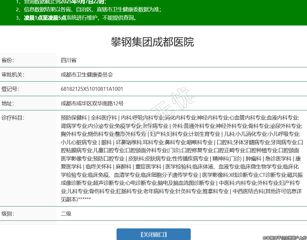 省份:四川省審批機關:成都市衛(wèi)生健康委員會登記號:68182125X51010811A1001地址:成都市成華區(qū)雙華南路12號診療科目:預防保健科 | 全科醫(yī)療科 | 內(nèi)科;呼吸內(nèi)科專業(yè);消化內(nèi)科專業(yè);神經(jīng)內(nèi)科專業(yè);心血管內(nèi)科專業(yè);血液內(nèi)科專業(yè);腎病學專業(yè);內(nèi)分泌專業(yè);免疫學專業(yè);老年病專業(yè) | 外科;普通外科專業(yè);神經(jīng)外科專業(yè);骨科專業(yè);泌尿外科專業(yè);胸外科專業(yè);燒傷科專業(yè);整形外科專業(yè) | 婦產(chǎn)科;婦科專業(yè);計劃生育專業(yè) | 兒科;小兒消化專業(yè);小兒呼吸專業(yè);小兒心臟病專業(yè) | 眼科 | 耳鼻咽喉科;耳科專業(yè);鼻科專業(yè);咽喉科專業(yè) | 口腔科;牙體牙髓病專業(yè);牙周病專業(yè);口腔粘膜病專業(yè);兒童口腔專業(yè);口腔頜面外科專業(yè)(門診);口腔修復專業(yè);口腔正畸專業(yè);口腔種植專業(yè);口腔頜面醫(yī)學影像專業(yè);預防口腔專業(yè) | 皮膚科;皮膚病專業(yè);性傳播疾病專業(yè) | 精神科(門診) | 腫瘤科 | 急診醫(yī)學科 | 康復醫(yī)學科 | 臨終關懷科 | 麻醉科 | 重癥醫(yī)學科 | 醫(yī)學檢驗科;臨床體液、血液專業(yè);臨床微生物學專業(yè);臨床化學檢驗專業(yè);臨床免疫、血清學專業(yè);臨床細胞分子遺傳學專業(yè) | 醫(yī)學影像科;X線診斷專業(yè);CT診斷專業(yè);磁共振成像診斷專業(yè);超聲診斷專業(yè);心電診斷專業(yè);腦電及腦血流圖診斷專業(yè) | 中醫(yī)科;內(nèi)科專業(yè);外科專業(yè);婦產(chǎn)科專業(yè);兒科專業(yè);骨傷科專業(yè);肛腸科專業(yè);老年病科專業(yè);針灸科專業(yè);推拿科專業(yè) | 中西醫(yī)結(jié)合科(其他許可信息詳見副本)******級別:二級法定代表人:余生源主要負責人:余生源執(zhí)業(yè)許可證有效期:2021/07/06 -至- 2028/01/11 -