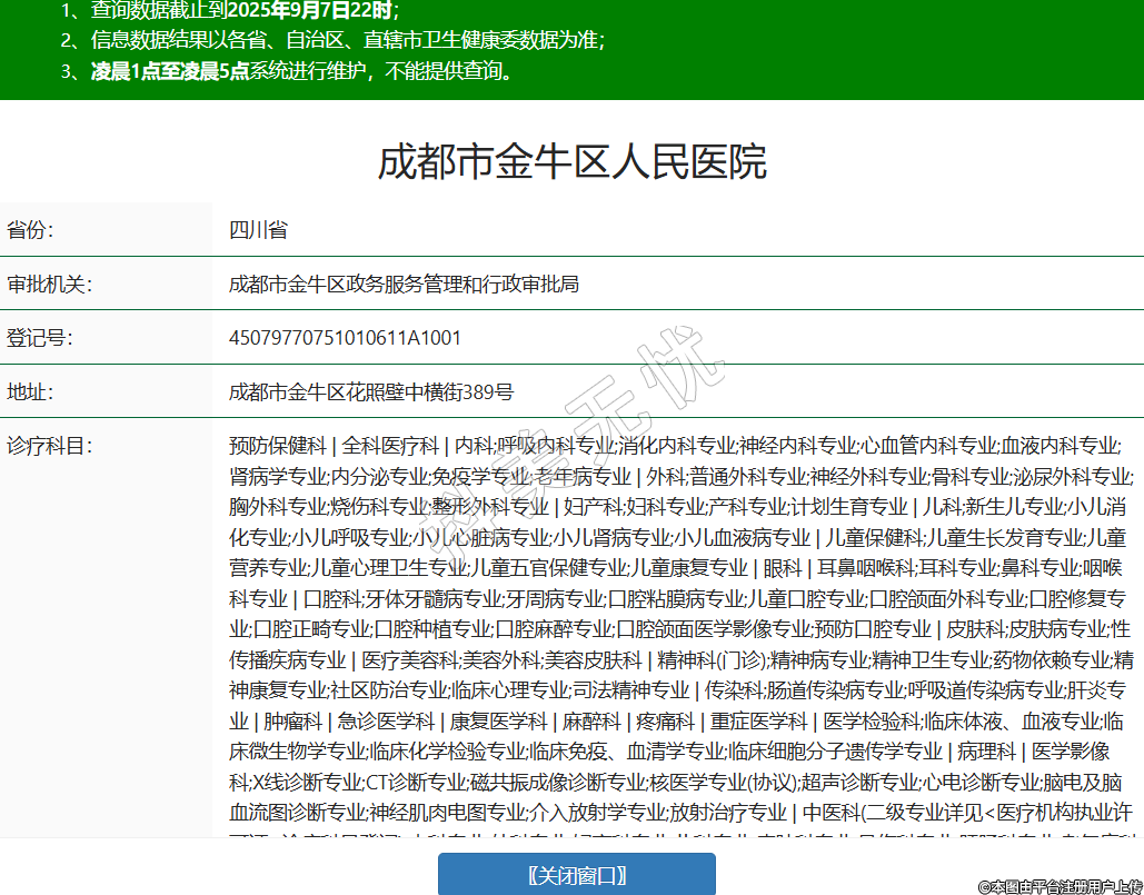 省份:四川省審批機關(guān):成都市金牛區(qū)政務(wù)服務(wù)管理和行政審批局登記號:45079770751010611A1001地址:成都市金牛區(qū)花照壁中橫街389號診療科目:預(yù)防保健科 | 全科醫(yī)療科 | 內(nèi)科;呼吸內(nèi)科專業(yè);消化內(nèi)科專業(yè);神經(jīng)內(nèi)科專業(yè);心血管內(nèi)科專業(yè);血液內(nèi)科專業(yè);腎病學專業(yè);內(nèi)分泌專業(yè);免疫學專業(yè);老年病專業(yè) | 外科;普通外科專業(yè);神經(jīng)外科專業(yè);骨科專業(yè);泌尿外科專業(yè);胸外科專業(yè);燒傷科專業(yè);整形外科專業(yè) | 婦產(chǎn)科;婦科專業(yè);產(chǎn)科專業(yè);計劃生育專業(yè) | 兒科;新生兒專業(yè);小兒消化專業(yè);小兒呼吸專業(yè);小兒心臟病專業(yè);小兒腎病專業(yè);小兒血液病專業(yè) | 兒童保健科;兒童生長發(fā)育專業(yè);兒童營養(yǎng)專業(yè);兒童心理衛(wèi)生專業(yè);兒童五官保健專業(yè);兒童康復(fù)專業(yè) | 眼科 | 耳鼻咽喉科;耳科專業(yè);鼻科專業(yè);咽喉科專業(yè) | 口腔科;牙體牙髓病專業(yè);牙周病專業(yè);口腔粘膜病專業(yè);兒童口腔專業(yè);口腔頜面外科專業(yè);口腔修復(fù)專業(yè);口腔正畸專業(yè);口腔種植專業(yè);口腔麻醉專業(yè);口腔頜面醫(yī)學影像專業(yè);預(yù)防口腔專業(yè) | 皮膚科;皮膚病專業(yè);性傳播疾病專業(yè) | 醫(yī)療美容科;美容外科;美容皮膚科 | 精神科(門診);精神病專業(yè);精神衛(wèi)生專業(yè);藥物依賴專業(yè);精神康復(fù)專業(yè);社區(qū)防治專業(yè);臨床心理專業(yè);司法精神專業(yè) | 傳染科;腸道傳染病專業(yè);呼吸道傳染病專業(yè);肝炎專業(yè) | 腫瘤科 | 急診醫(yī)學科 | 康復(fù)醫(yī)學科 | 麻醉科 | 疼痛科 | 重癥醫(yī)學科 | 醫(yī)學檢驗科;臨床體液、血液專業(yè);臨床微生物學專業(yè);臨床化學檢驗專業(yè);臨床免疫、血清學專業(yè);臨床細胞分子遺傳學專業(yè) | 病理科 | 醫(yī)學影像科;X線診斷專業(yè);CT診斷專業(yè);磁共振成像診斷專業(yè);核醫(yī)學專業(yè)(協(xié)議);超聲診斷專業(yè);心電診斷專業(yè);腦電及腦血流圖診斷專業(yè);神經(jīng)肌肉電圖專業(yè);介入放射學專業(yè);放射治療專業(yè) | 中醫(yī)科(二級專業(yè)詳見<醫(yī)療機構(gòu)執(zhí)業(yè)許可證>診療科目登記);內(nèi)科專業(yè);外科專業(yè);婦產(chǎn)科專業(yè);兒科專業(yè);皮膚科專業(yè);骨傷科專業(yè);肛腸科專業(yè);老年病科專業(yè);針灸科專業(yè);推拿科專業(yè);康復(fù)醫(yī)學專業(yè) | 中西醫(yī)結(jié)合科******級別:三級法定代表人:翁一文主要負責人: -