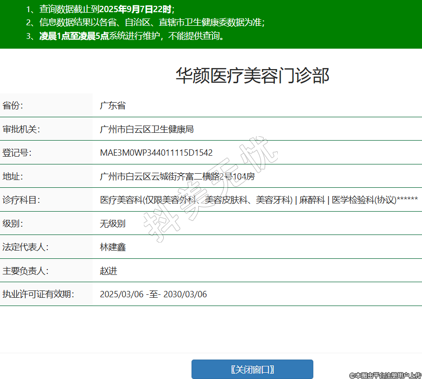 省份:廣東省審批機關(guān):廣州市白云區(qū)衛(wèi)生健康局登記號:MAE3M0WP344011115D1542地址:廣州市白云區(qū)云城街齊富二橫路2號104房診療科目:醫(yī)療美容科(僅限美容外科、美容皮膚科、美容牙科) | 麻醉科 | 醫(yī)學檢驗科(協(xié)議)******級別:無級別法定代表人:林建鑫主要負責人:趙進執(zhí)業(yè)許可證有效期:2025/03/06 -至- 2030/03/06 -