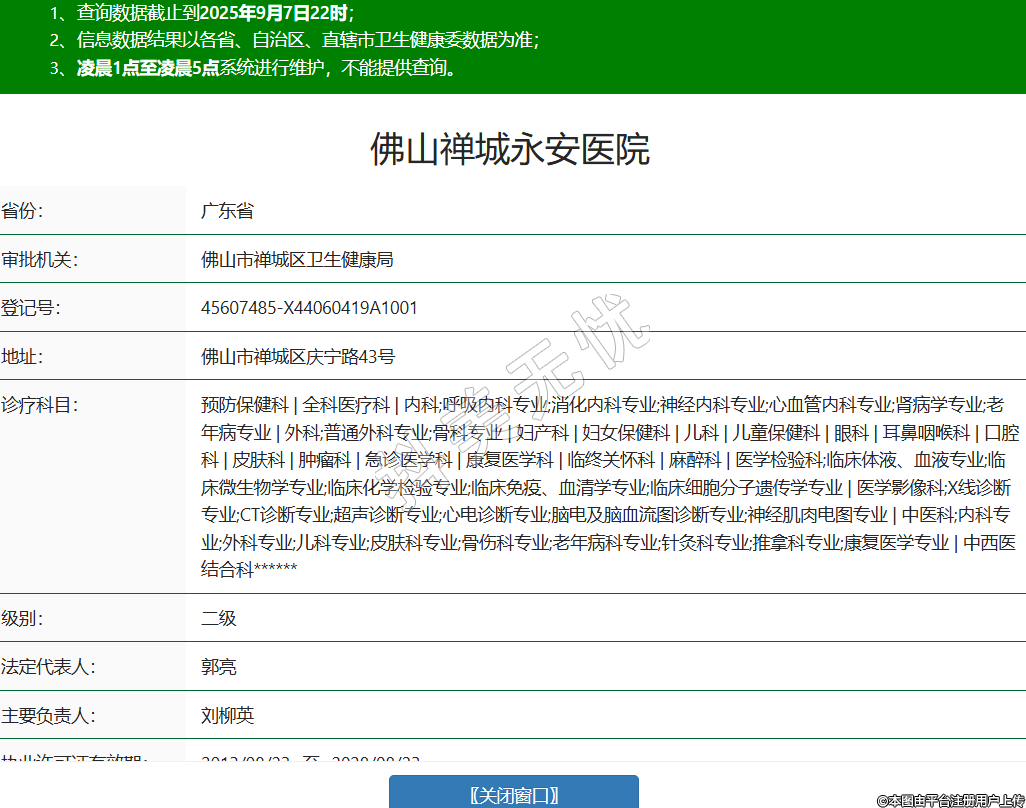 省份:廣東省審批機關(guān):佛山市禪城區(qū)衛(wèi)生健康局登記號:45607485-X44060419A1001地址:佛山市禪城區(qū)慶寧路43號診療科目:預(yù)防保健科 | 全科醫(yī)療科 | 內(nèi)科;呼吸內(nèi)科專業(yè);消化內(nèi)科專業(yè);神經(jīng)內(nèi)科專業(yè);心血管內(nèi)科專業(yè);腎病學(xué)專業(yè);老年病專業(yè) | 外科;普通外科專業(yè);骨科專業(yè) | 婦產(chǎn)科 | 婦女保健科 | 兒科 | 兒童保健科 | 眼科 | 耳鼻咽喉科 | 口腔科 | 皮膚科 | 腫瘤科 | 急診醫(yī)學(xué)科 | 康復(fù)醫(yī)學(xué)科 | 臨終關(guān)懷科 | 麻醉科 | 醫(yī)學(xué)檢驗科;臨床體液、血液專業(yè);臨床微生物學(xué)專業(yè);臨床化學(xué)檢驗專業(yè);臨床免疫、血清學(xué)專業(yè);臨床細胞分子遺傳學(xué)專業(yè) | 醫(yī)學(xué)影像科;X線診斷專業(yè);CT診斷專業(yè);超聲診斷專業(yè);心電診斷專業(yè);腦電及腦血流圖診斷專業(yè);神經(jīng)肌肉電圖專業(yè) | 中醫(yī)科;內(nèi)科專業(yè);外科專業(yè);兒科專業(yè);皮膚科專業(yè);骨傷科專業(yè);老年病科專業(yè);針灸科專業(yè);推拿科專業(yè);康復(fù)醫(yī)學(xué)專業(yè) | 中西醫(yī)結(jié)合科******級別:二級法定代表人:郭亮主要負責(zé)人:劉柳英執(zhí)業(yè)許可證有效期:2013/08/23 -至- 2028/08/23 -