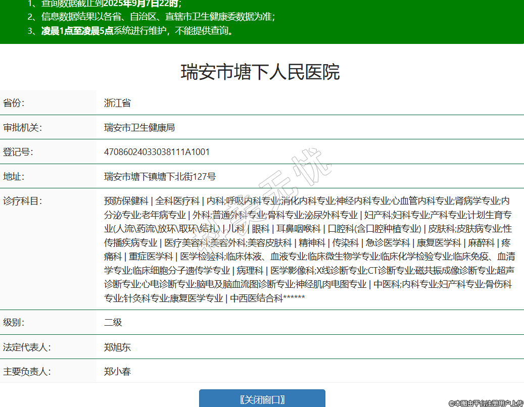 省份:浙江省審批機關(guān):瑞安市衛(wèi)生健康局登記號:47086024033038111A1001地址:瑞安市塘下鎮(zhèn)塘下北街127號診療科目:預(yù)防保健科 | 全科醫(yī)療科 | 內(nèi)科;呼吸內(nèi)科專業(yè);消化內(nèi)科專業(yè);神經(jīng)內(nèi)科專業(yè);心血管內(nèi)科專業(yè);腎病學(xué)專業(yè);內(nèi)分泌專業(yè);老年病專業(yè) | 外科;普通外科專業(yè);骨科專業(yè);泌尿外科專業(yè) | 婦產(chǎn)科;婦科專業(yè);產(chǎn)科專業(yè);計劃生育專業(yè)(人流\藥流\放環(huán)\取環(huán)\結(jié)扎) | 兒科 | 眼科 | 耳鼻咽喉科 | 口腔科(含口腔種植專業(yè)) | 皮膚科;皮膚病專業(yè);性傳播疾病專業(yè) | 醫(yī)療美容科;美容外科;美容皮膚科 | 精神科 | 傳染科 | 急診醫(yī)學(xué)科 | 康復(fù)醫(yī)學(xué)科 | 麻醉科 | 疼痛科 | 重癥醫(yī)學(xué)科 | 醫(yī)學(xué)檢驗科;臨床體液、血液專業(yè);臨床微生物學(xué)專業(yè);臨床化學(xué)檢驗專業(yè);臨床免疫、血清學(xué)專業(yè);臨床細(xì)胞分子遺傳學(xué)專業(yè) | 病理科 | 醫(yī)學(xué)影像科;X線診斷專業(yè);CT診斷專業(yè);磁共振成像診斷專業(yè);超聲診斷專業(yè);心電診斷專業(yè);腦電及腦血流圖診斷專業(yè);神經(jīng)肌肉電圖專業(yè) | 中醫(yī)科;內(nèi)科專業(yè);婦產(chǎn)科專業(yè);骨傷科專業(yè);針灸科專業(yè);康復(fù)醫(yī)學(xué)專業(yè) | 中西醫(yī)結(jié)合科******級別:二級法定代表人:鄭旭東主要負(fù)責(zé)人:鄭小春執(zhí)業(yè)許可證有效期:2023/03/13 -至- 2028/03/12 -