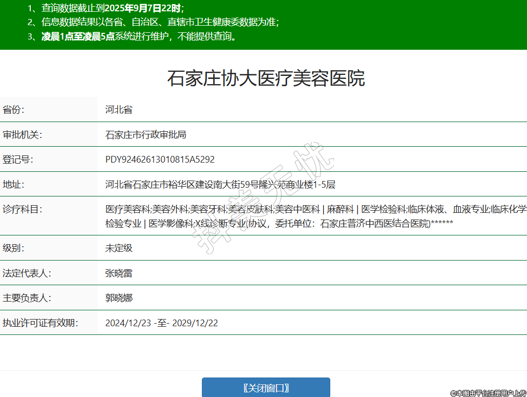 省份:河北省審批機關:石家莊市行政審批局登記號:PDY92462613010815A5292地址:河北省石家莊市裕華區(qū)建設南大街59號隆興苑商業(yè)樓1-5層診療科目:醫(yī)療美容科;美容外科;美容牙科;美容皮膚科;美容中醫(yī)科 | 麻醉科 | 醫(yī)學檢驗科;臨床體液、血液專業(yè);臨床化學檢驗專業(yè) | 醫(yī)學影像科;X線診斷專業(yè)(協(xié)議,委托單位:石家莊普濟中西醫(yī)結合醫(yī)院)******級別:未定級法定代表人:張曉雷主要負責人:郭曉娜執(zhí)業(yè)許可證有效期:2024/12/23 -至- 2029/12/22 -