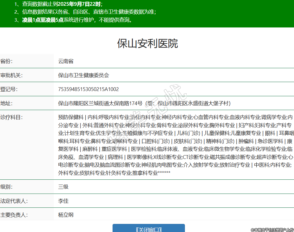 省份:云南省審批機(jī)關(guān):保山市衛(wèi)生健康委員會(huì)登記號(hào):75359485153050215A1002地址:保山市隆陽(yáng)區(qū)蘭城街道太保南路174號(hào)(增:保山市隆陽(yáng)區(qū)永盛街道大堡子村)診療科目:預(yù)防保健科 | 內(nèi)科;呼吸內(nèi)科專業(yè);消化內(nèi)科專業(yè);神經(jīng)內(nèi)科專業(yè);心血管內(nèi)科專業(yè);血液內(nèi)科專業(yè);腎病學(xué)專業(yè);內(nèi)分泌專業(yè) | 外科;普通外科專業(yè);神經(jīng)外科專業(yè);骨科專業(yè);泌尿外科專業(yè);胸外科專業(yè) | 婦產(chǎn)科;婦科專業(yè);產(chǎn)科專業(yè);計(jì)劃生育專業(yè);優(yōu)生學(xué)專業(yè);生殖健康與不孕癥專業(yè) | 兒科(門診) | 兒童保健科;兒童康復(fù)專業(yè) | 眼科 | 耳鼻咽喉科;耳科專業(yè);鼻科專業(yè);咽喉科專業(yè) | 口腔科(門診) | 皮膚科(門診) | 精神科(門診) | 腫瘤科 | 急診醫(yī)學(xué)科 | 康復(fù)醫(yī)學(xué)科 | 麻醉科 | 重癥醫(yī)學(xué)科 | 醫(yī)學(xué)檢驗(yàn)科;臨床體液、血液專業(yè);臨床微生物學(xué)專業(yè);臨床化學(xué)檢驗(yàn)專業(yè);臨床免疫、血清學(xué)專業(yè) | 病理科 | 醫(yī)學(xué)影像科;X線診斷專業(yè);CT診斷專業(yè);磁共振成像診斷專業(yè);超聲診斷專業(yè);心電診斷專業(yè);腦電及腦血流圖診斷專業(yè);神經(jīng)肌肉電圖專業(yè);介入放射學(xué)專業(yè);放射治療專業(yè) | 中醫(yī)科;內(nèi)科專業(yè);外科專業(yè);皮膚科專業(yè);針灸科專業(yè);推拿科專業(yè)******級(jí)別:三級(jí)法定代表人:李佳主要負(fù)責(zé)人:楊立綱執(zhí)業(yè)許可證有效期:2025/07/28 -至- 2035/01/08 -