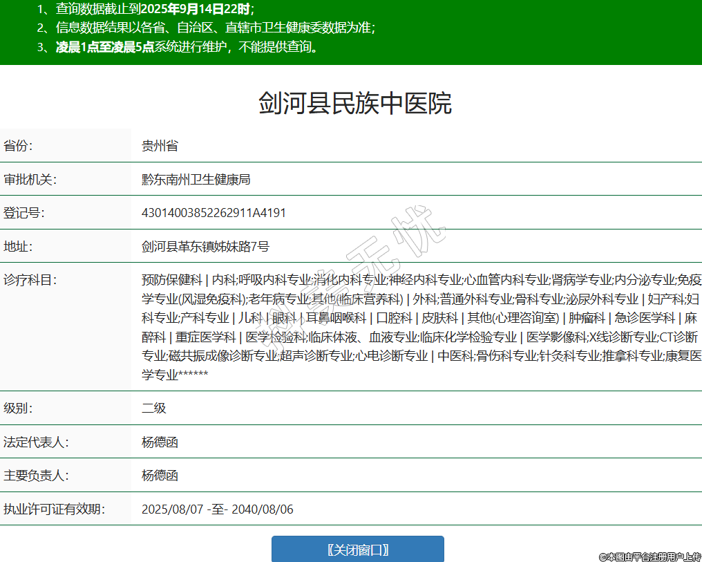 省份:貴州省審批機(jī)關(guān):黔東南州衛(wèi)生健康局登記號(hào):43014003852262911A4191地址:劍河縣革東鎮(zhèn)姊妹路7號(hào)診療科目:預(yù)防保健科 | 內(nèi)科;呼吸內(nèi)科專業(yè);消化內(nèi)科專業(yè);神經(jīng)內(nèi)科專業(yè);心血管內(nèi)科專業(yè);腎病學(xué)專業(yè);內(nèi)分泌專業(yè);免疫學(xué)專業(yè)(風(fēng)濕免疫科);老年病專業(yè);其他(臨床營養(yǎng)科) | 外科;普通外科專業(yè);骨科專業(yè);泌尿外科專業(yè) | 婦產(chǎn)科;婦科專業(yè);產(chǎn)科專業(yè) | 兒科 | 眼科 | 耳鼻咽喉科 | 口腔科 | 皮膚科 | 其他(心理咨詢室) | 腫瘤科 | 急診醫(yī)學(xué)科 | 麻醉科 | 重癥醫(yī)學(xué)科 | 醫(yī)學(xué)檢驗(yàn)科;臨床體液、血液專業(yè);臨床化學(xué)檢驗(yàn)專業(yè) | 醫(yī)學(xué)影像科;X線診斷專業(yè);CT診斷專業(yè);磁共振成像診斷專業(yè);超聲診斷專業(yè);心電診斷專業(yè) | 中醫(yī)科;骨傷科專業(yè);針灸科專業(yè);推拿科專業(yè);康復(fù)醫(yī)學(xué)專業(yè)******級(jí)別:二級(jí)法定代表人:楊德函主要負(fù)責(zé)人:楊德函執(zhí)業(yè)許可證有效期:2025/08/07 -至- 2040/08/06 -