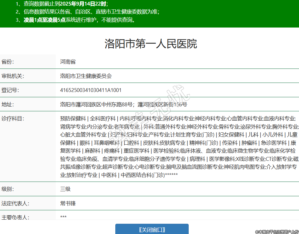省份:河南省審批機(jī)關(guān):洛陽市衛(wèi)生健康委員會登記號:41652500341030411A1001地址:洛陽市瀍河回族區(qū)中州東路88號;瀍河回族區(qū)新街156號診療科目:預(yù)防保健科 | 全科醫(yī)療科 | 內(nèi)科;呼吸內(nèi)科專業(yè);消化內(nèi)科專業(yè);神經(jīng)內(nèi)科專業(yè);心血管內(nèi)科專業(yè);血液內(nèi)科專業(yè);腎病學(xué)專業(yè);內(nèi)分泌專業(yè);老年病專業(yè) | 外科;普通外科專業(yè);神經(jīng)外科專業(yè);骨科專業(yè);泌尿外科專業(yè);胸外科專業(yè);心臟大血管外科專業(yè) | 婦產(chǎn)科;婦科專業(yè);產(chǎn)科專業(yè);計劃生育專業(yè)(門診) | 婦女保健科 | 兒科 | 小兒外科 | 兒童保健科 | 眼科 | 耳鼻咽喉科 | 口腔科 | 皮膚科;皮膚病專業(yè) | 精神科(門診) | 傳染科 | 腫瘤科 | 急診醫(yī)學(xué)科 | 康復(fù)醫(yī)學(xué)科 | 麻醉科 | 疼痛科 | 重癥醫(yī)學(xué)科 | 醫(yī)學(xué)檢驗(yàn)科;臨床體液、血液專業(yè);臨床微生物學(xué)專業(yè);臨床化學(xué)檢驗(yàn)專業(yè);臨床免疫、血清學(xué)專業(yè);臨床細(xì)胞分子遺傳學(xué)專業(yè) | 病理科 | 醫(yī)學(xué)影像科;X線診斷專業(yè);CT診斷專業(yè);磁共振成像診斷專業(yè);超聲診斷專業(yè);心電診斷專業(yè);腦電及腦血流圖診斷專業(yè);神經(jīng)肌肉電圖專業(yè);介入放射學(xué)專業(yè);放射治療專業(yè) | 中醫(yī)科 | 中西醫(yī)結(jié)合科(門診)******級別:三級法定代表人:常書鋒主要負(fù)責(zé)人:***執(zhí)業(yè)許可證有效期:2025/08/11 -至- 2033/04/07 -