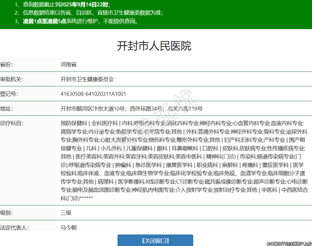 省份:河南省審批機(jī)關(guān):開封市衛(wèi)生健康委員會登記號:41630508-641020311A1001地址:開封市順河區(qū)汴京大道10號;西外環(huán)路34號;北關(guān)六街119號診療科目:預(yù)防保健科 | 全科醫(yī)療科 | 內(nèi)科;呼吸內(nèi)科專業(yè);消化內(nèi)科專業(yè);神經(jīng)內(nèi)科專業(yè);心血管內(nèi)科專業(yè);血液內(nèi)科專業(yè);腎病學(xué)專業(yè);內(nèi)分泌專業(yè);免疫學(xué)專業(yè);老年病專業(yè);其他 | 外科;普通外科專業(yè);神經(jīng)外科專業(yè);骨科專業(yè);泌尿外科專業(yè);胸外科專業(yè);心臟大血管外科專業(yè);燒傷科專業(yè);整形外科專業(yè);其他 | 婦產(chǎn)科;婦科專業(yè);產(chǎn)科專業(yè) | 圍產(chǎn)期保健專業(yè) | 兒科 | 小兒外科 | 兒童保健科 | 眼科 | 耳鼻咽喉科 | 口腔科 | 皮膚科;皮膚病專業(yè);性傳播疾病專業(yè);其他 | 醫(yī)療美容科;美容外科;美容牙科;美容皮膚科;美容中醫(yī)科 | 精神科(門診) | 傳染科;腸道傳染病專業(yè)(門診);呼吸道傳染病專業(yè) | 腫瘤科 | 急診醫(yī)學(xué)科 | 康復(fù)醫(yī)學(xué)科 | 職業(yè)病科 | 麻醉科 | 疼痛科 | 重癥醫(yī)學(xué)科 | 醫(yī)學(xué)檢驗科;臨床體液、血液專業(yè);臨床微生物學(xué)專業(yè);臨床化學(xué)檢驗專業(yè);臨床免疫、血清學(xué)專業(yè);臨床細(xì)胞分子遺傳學(xué)專業(yè);其他 | 病理科 | 醫(yī)學(xué)影像科;X線診斷專業(yè);CT診斷專業(yè);磁共振成像診斷專業(yè);超聲診斷專業(yè);心電診斷專業(yè);腦電及腦血流圖診斷專業(yè);神經(jīng)肌肉電圖專業(yè);介入放射學(xué)專業(yè);放射治療專業(yè);其他 | 中醫(yī)科 | 中西醫(yī)結(jié)合科(門診)******級別:三級法定代表人:馬今朝主要負(fù)責(zé)人:***執(zhí)業(yè)許可證有效期:2024/12/23 -至- 2033/04/07 -