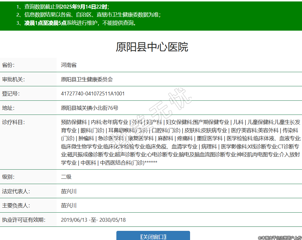 省份:河南省審批機(jī)關(guān):原陽縣衛(wèi)生健康委員會(huì)登記號(hào):41727740-041072511A1001地址:原陽縣城關(guān)鎮(zhèn)小北街76號(hào)診療科目:預(yù)防保健科 | 內(nèi)科;老年病專業(yè) | 外科 | 婦產(chǎn)科 | 婦女保健科;圍產(chǎn)期保健專業(yè) | 兒科 | 兒童保健科;兒童生長(zhǎng)發(fā)育專業(yè) | 眼科(門診) | 耳鼻咽喉科(門診) | 口腔科(門診) | 皮膚科;皮膚病專業(yè) | 醫(yī)療美容科;美容外科 | 傳染科(門診) | 腫瘤科 | 急診醫(yī)學(xué)科 | 康復(fù)醫(yī)學(xué)科 | 麻醉科 | 疼痛科 | 重癥醫(yī)學(xué)科 | 醫(yī)學(xué)檢驗(yàn)科;臨床體液、血液專業(yè);臨床微生物學(xué)專業(yè);臨床化學(xué)檢驗(yàn)專業(yè);臨床免疫、血清學(xué)專業(yè) | 病理科 | 醫(yī)學(xué)影像科;X線診斷專業(yè);CT診斷專業(yè);磁共振成像診斷專業(yè);超聲診斷專業(yè);心電診斷專業(yè);腦電及腦血流圖診斷專業(yè);神經(jīng)肌肉電圖專業(yè);介入放射學(xué)專業(yè) | 中醫(yī)科 | 中西醫(yī)結(jié)合科(門診)******級(jí)別:二級(jí)法定代表人:苗興川主要負(fù)責(zé)人:苗興川執(zhí)業(yè)許可證有效期:2019/06/13 -至- 2030/05/18 -