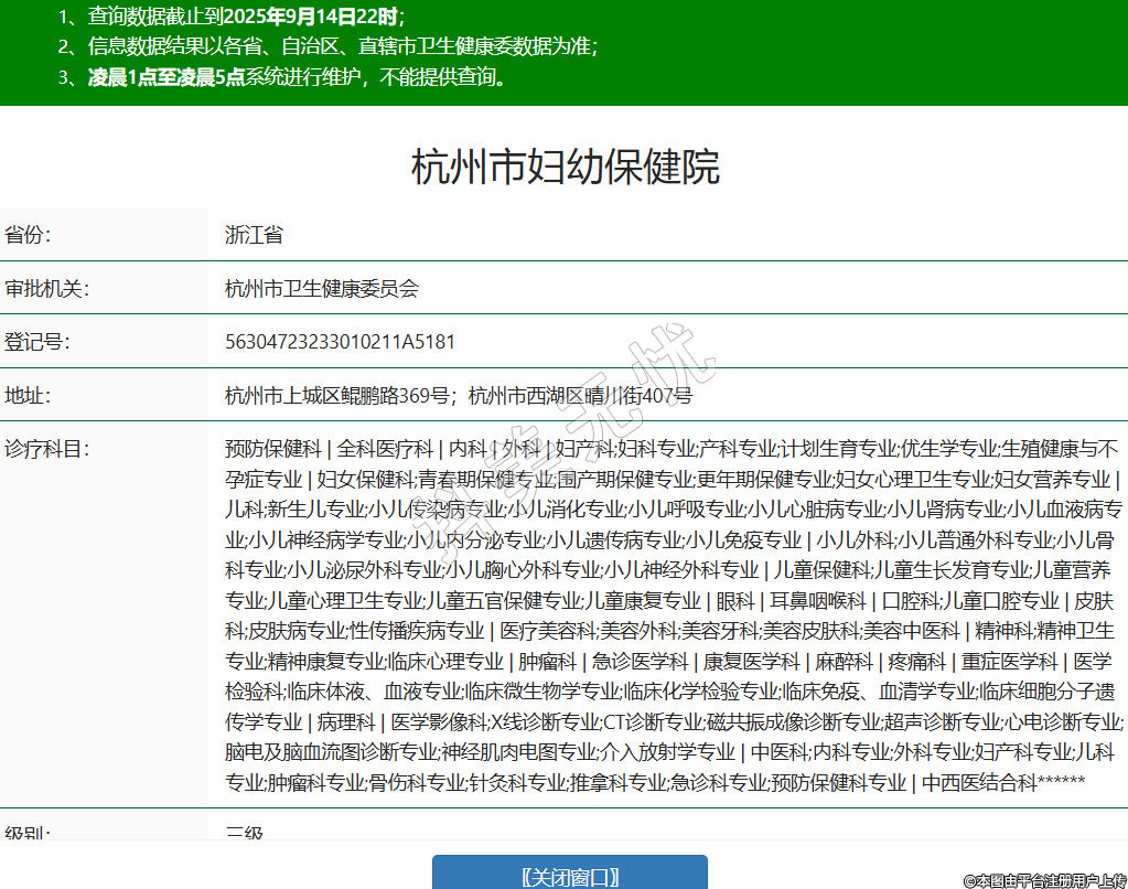省份:浙江省審批機關:杭州市衛(wèi)生健康委員會登記號:56304723233010211A5181地址:杭州市上城區(qū)鯤鵬路369號;杭州市西湖區(qū)晴川街407號診療科目:預防保健科 | 全科醫(yī)療科 | 內(nèi)科 | 外科 | 婦產(chǎn)科;婦科專業(yè);產(chǎn)科專業(yè);計劃生育專業(yè);優(yōu)生學專業(yè);生殖健康與不孕癥專業(yè) | 婦女保健科;青春期保健專業(yè);圍產(chǎn)期保健專業(yè);更年期保健專業(yè);婦女心理衛(wèi)生專業(yè);婦女營養(yǎng)專業(yè) | 兒科;新生兒專業(yè);小兒傳染病專業(yè);小兒消化專業(yè);小兒呼吸專業(yè);小兒心臟病專業(yè);小兒腎病專業(yè);小兒血液病專業(yè);小兒神經(jīng)病學專業(yè);小兒內(nèi)分泌專業(yè);小兒遺傳病專業(yè);小兒免疫專業(yè) | 小兒外科;小兒普通外科專業(yè);小兒骨科專業(yè);小兒泌尿外科專業(yè);小兒胸心外科專業(yè);小兒神經(jīng)外科專業(yè) | 兒童保健科;兒童生長發(fā)育專業(yè);兒童營養(yǎng)專業(yè);兒童心理衛(wèi)生專業(yè);兒童五官保健專業(yè);兒童康復專業(yè) | 眼科 | 耳鼻咽喉科 | 口腔科;兒童口腔專業(yè) | 皮膚科;皮膚病專業(yè);性傳播疾病專業(yè) | 醫(yī)療美容科;美容外科;美容牙科;美容皮膚科;美容中醫(yī)科 | 精神科;精神衛(wèi)生專業(yè);精神康復專業(yè);臨床心理專業(yè) | 腫瘤科 | 急診醫(yī)學科 | 康復醫(yī)學科 | 麻醉科 | 疼痛科 | 重癥醫(yī)學科 | 醫(yī)學檢驗科;臨床體液、血液專業(yè);臨床微生物學專業(yè);臨床化學檢驗專業(yè);臨床免疫、血清學專業(yè);臨床細胞分子遺傳學專業(yè) | 病理科 | 醫(yī)學影像科;X線診斷專業(yè);CT診斷專業(yè);磁共振成像診斷專業(yè);超聲診斷專業(yè);心電診斷專業(yè);腦電及腦血流圖診斷專業(yè);神經(jīng)肌肉電圖專業(yè);介入放射學專業(yè) | 中醫(yī)科;內(nèi)科專業(yè);外科專業(yè);婦產(chǎn)科專業(yè);兒科專業(yè);腫瘤科專業(yè);骨傷科專業(yè);針灸科專業(yè);推拿科專業(yè);急診科專業(yè);預防保健科專業(yè) | 中西醫(yī)結合科******級別:三級法定代表人:李香娟主要負責人:李香娟執(zhí)業(yè)許可證有效期:2025/08/11 -至- 2029/10/19 -