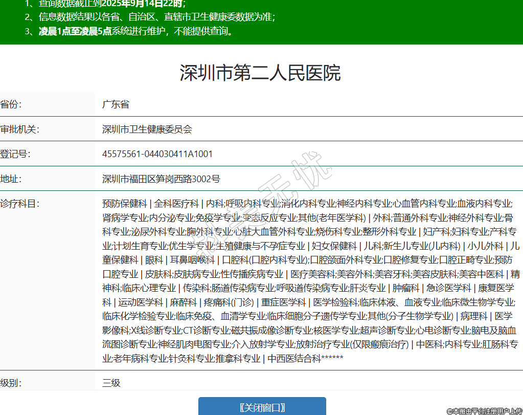 省份:廣東省審批機關(guān):深圳市衛(wèi)生健康委員會登記號:45575561-044030411A1001地址:深圳市福田區(qū)筍崗西路3002號診療科目:預(yù)防保健科 | 全科醫(yī)療科 | 內(nèi)科;呼吸內(nèi)科專業(yè);消化內(nèi)科專業(yè);神經(jīng)內(nèi)科專業(yè);心血管內(nèi)科專業(yè);血液內(nèi)科專業(yè);腎病學(xué)專業(yè);內(nèi)分泌專業(yè);免疫學(xué)專業(yè);變態(tài)反應(yīng)專業(yè);其他(老年醫(yī)學(xué)科) | 外科;普通外科專業(yè);神經(jīng)外科專業(yè);骨科專業(yè);泌尿外科專業(yè);胸外科專業(yè);心臟大血管外科專業(yè);燒傷科專業(yè);整形外科專業(yè) | 婦產(chǎn)科;婦科專業(yè);產(chǎn)科專業(yè);計劃生育專業(yè);優(yōu)生學(xué)專業(yè);生殖健康與不孕癥專業(yè) | 婦女保健科 | 兒科;新生兒專業(yè)(兒內(nèi)科) | 小兒外科 | 兒童保健科 | 眼科 | 耳鼻咽喉科 | 口腔科(口腔內(nèi)科專業(yè));口腔頜面外科專業(yè);口腔修復(fù)專業(yè);口腔正畸專業(yè);預(yù)防口腔專業(yè) | 皮膚科;皮膚病專業(yè);性傳播疾病專業(yè) | 醫(yī)療美容科;美容外科;美容牙科;美容皮膚科;美容中醫(yī)科 | 精神科;臨床心理專業(yè) | 傳染科;腸道傳染病專業(yè);呼吸道傳染病專業(yè);肝炎專業(yè) | 腫瘤科 | 急診醫(yī)學(xué)科 | 康復(fù)醫(yī)學(xué)科 | 運動醫(yī)學(xué)科 | 麻醉科 | 疼痛科(門診) | 重癥醫(yī)學(xué)科 | 醫(yī)學(xué)檢驗科;臨床體液、血液專業(yè);臨床微生物學(xué)專業(yè);臨床化學(xué)檢驗專業(yè);臨床免疫、血清學(xué)專業(yè);臨床細(xì)胞分子遺傳學(xué)專業(yè);其他(分子生物學(xué)專業(yè)) | 病理科 | 醫(yī)學(xué)影像科;X線診斷專業(yè);CT診斷專業(yè);磁共振成像診斷專業(yè);核醫(yī)學(xué)專業(yè);超聲診斷專業(yè);心電診斷專業(yè);腦電及腦血流圖診斷專業(yè);神經(jīng)肌肉電圖專業(yè);介入放射學(xué)專業(yè);放射治療專業(yè)(僅限瘢痕治療) | 中醫(yī)科;內(nèi)科專業(yè);肛腸科專業(yè);老年病科專業(yè);針灸科專業(yè);推拿科專業(yè) | 中西醫(yī)結(jié)合科******級別:三級法定代表人:曾暉主要負(fù)責(zé)人:***執(zhí)業(yè)許可證有效期:2022/02/15 -至- 2037/02/14 -