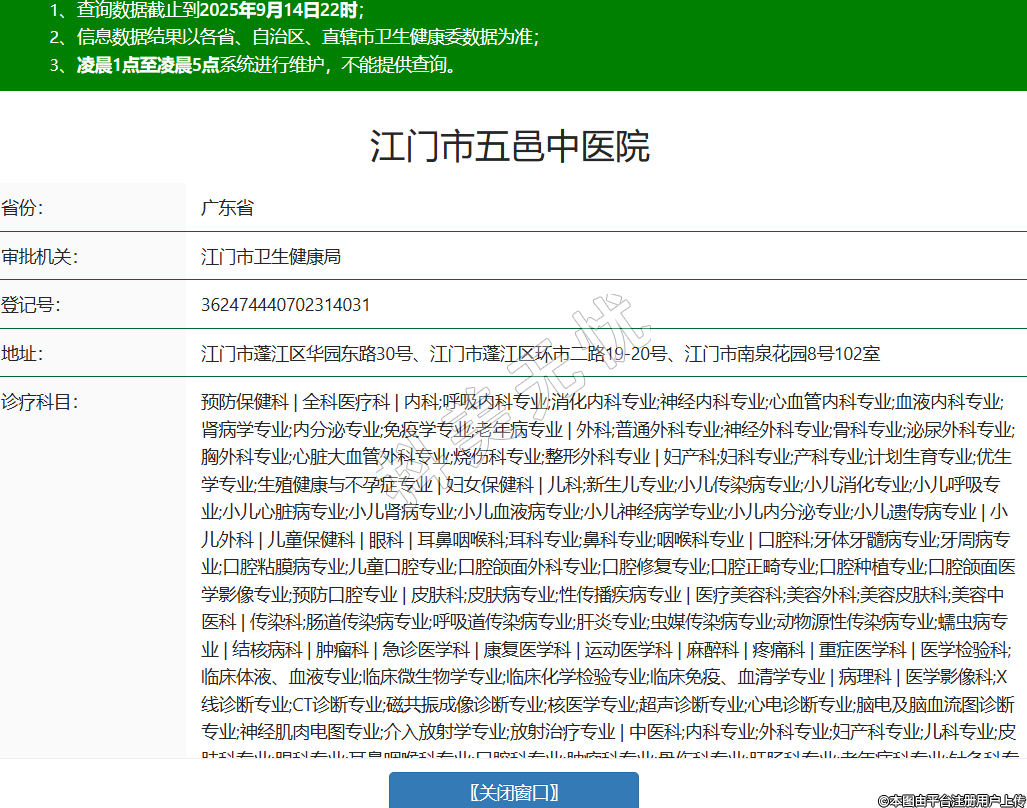 省份:廣東省審批機關(guān):江門市衛(wèi)生健康局登記號:362474440702314031地址:江門市蓬江區(qū)華園東路30號、江門市蓬江區(qū)環(huán)市二路19-20號、江門市南泉花園8號102室診療科目:預(yù)防保健科 | 全科醫(yī)療科 | 內(nèi)科;呼吸內(nèi)科專業(yè);消化內(nèi)科專業(yè);神經(jīng)內(nèi)科專業(yè);心血管內(nèi)科專業(yè);血液內(nèi)科專業(yè);腎病學(xué)專業(yè);內(nèi)分泌專業(yè);免疫學(xué)專業(yè);老年病專業(yè) | 外科;普通外科專業(yè);神經(jīng)外科專業(yè);骨科專業(yè);泌尿外科專業(yè);胸外科專業(yè);心臟大血管外科專業(yè);燒傷科專業(yè);整形外科專業(yè) | 婦產(chǎn)科;婦科專業(yè);產(chǎn)科專業(yè);計劃生育專業(yè);優(yōu)生學(xué)專業(yè);生殖健康與不孕癥專業(yè) | 婦女保健科 | 兒科;新生兒專業(yè);小兒傳染病專業(yè);小兒消化專業(yè);小兒呼吸專業(yè);小兒心臟病專業(yè);小兒腎病專業(yè);小兒血液病專業(yè);小兒神經(jīng)病學(xué)專業(yè);小兒內(nèi)分泌專業(yè);小兒遺傳病專業(yè) | 小兒外科 | 兒童保健科 | 眼科 | 耳鼻咽喉科;耳科專業(yè);鼻科專業(yè);咽喉科專業(yè) | 口腔科;牙體牙髓病專業(yè);牙周病專業(yè);口腔粘膜病專業(yè);兒童口腔專業(yè);口腔頜面外科專業(yè);口腔修復(fù)專業(yè);口腔正畸專業(yè);口腔種植專業(yè);口腔頜面醫(yī)學(xué)影像專業(yè);預(yù)防口腔專業(yè) | 皮膚科;皮膚病專業(yè);性傳播疾病專業(yè) | 醫(yī)療美容科;美容外科;美容皮膚科;美容中醫(yī)科 | 傳染科;腸道傳染病專業(yè);呼吸道傳染病專業(yè);肝炎專業(yè);蟲媒傳染病專業(yè);動物源性傳染病專業(yè);蠕蟲病專業(yè) | 結(jié)核病科 | 腫瘤科 | 急診醫(yī)學(xué)科 | 康復(fù)醫(yī)學(xué)科 | 運動醫(yī)學(xué)科 | 麻醉科 | 疼痛科 | 重癥醫(yī)學(xué)科 | 醫(yī)學(xué)檢驗科;臨床體液、血液專業(yè);臨床微生物學(xué)專業(yè);臨床化學(xué)檢驗專業(yè);臨床免疫、血清學(xué)專業(yè) | 病理科 | 醫(yī)學(xué)影像科;X線診斷專業(yè);CT診斷專業(yè);磁共振成像診斷專業(yè);核醫(yī)學(xué)專業(yè);超聲診斷專業(yè);心電診斷專業(yè);腦電及腦血流圖診斷專業(yè);神經(jīng)肌肉電圖專業(yè);介入放射學(xué)專業(yè);放射治療專業(yè) | 中醫(yī)科;內(nèi)科專業(yè);外科專業(yè);婦產(chǎn)科專業(yè);兒科專業(yè);皮膚科專業(yè);眼科專業(yè);耳鼻咽喉科專業(yè);口腔科專業(yè);腫瘤科專業(yè);骨傷科專業(yè);肛腸科專業(yè);老年病科專業(yè);針灸科專業(yè);推拿科專業(yè);康復(fù)醫(yī)學(xué)專業(yè);急診科專業(yè);預(yù)防保健科專業(yè) | 中西醫(yī)結(jié)合科******級別:三級法定代表人:章光華主要負(fù)責(zé)人:執(zhí)業(yè)許可證有效期:2025/08/05 -至- 2040/08/04 -