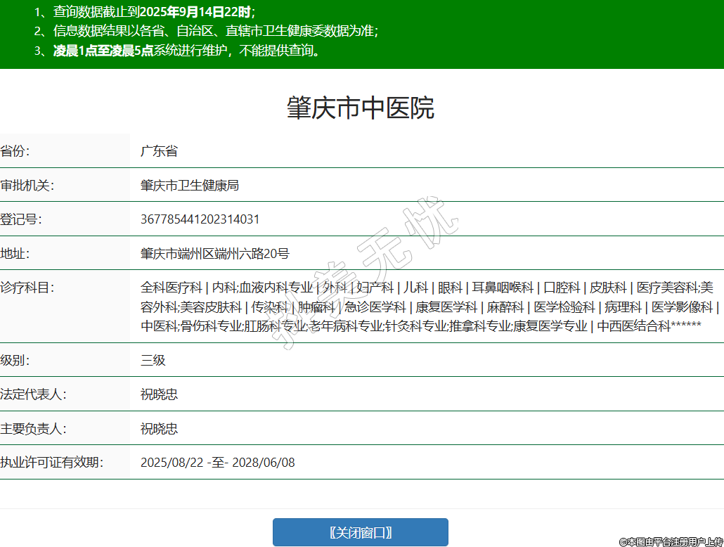 省份:廣東省審批機關(guān):肇慶市衛(wèi)生健康局登記號:367785441202314031地址:肇慶市端州區(qū)端州六路20號診療科目:全科醫(yī)療科 | 內(nèi)科;血液內(nèi)科專業(yè) | 外科 | 婦產(chǎn)科 | 兒科 | 眼科 | 耳鼻咽喉科 | 口腔科 | 皮膚科 | 醫(yī)療美容科;美容外科;美容皮膚科 | 傳染科 | 腫瘤科 | 急診醫(yī)學(xué)科 | 康復(fù)醫(yī)學(xué)科 | 麻醉科 | 醫(yī)學(xué)檢驗科 | 病理科 | 醫(yī)學(xué)影像科 | 中醫(yī)科;骨傷科專業(yè);肛腸科專業(yè);老年病科專業(yè);針灸科專業(yè);推拿科專業(yè);康復(fù)醫(yī)學(xué)專業(yè) | 中西醫(yī)結(jié)合科******級別:三級法定代表人:祝曉忠主要負責(zé)人:祝曉忠執(zhí)業(yè)許可證有效期:2025/08/22 -至- 2028/06/08 -