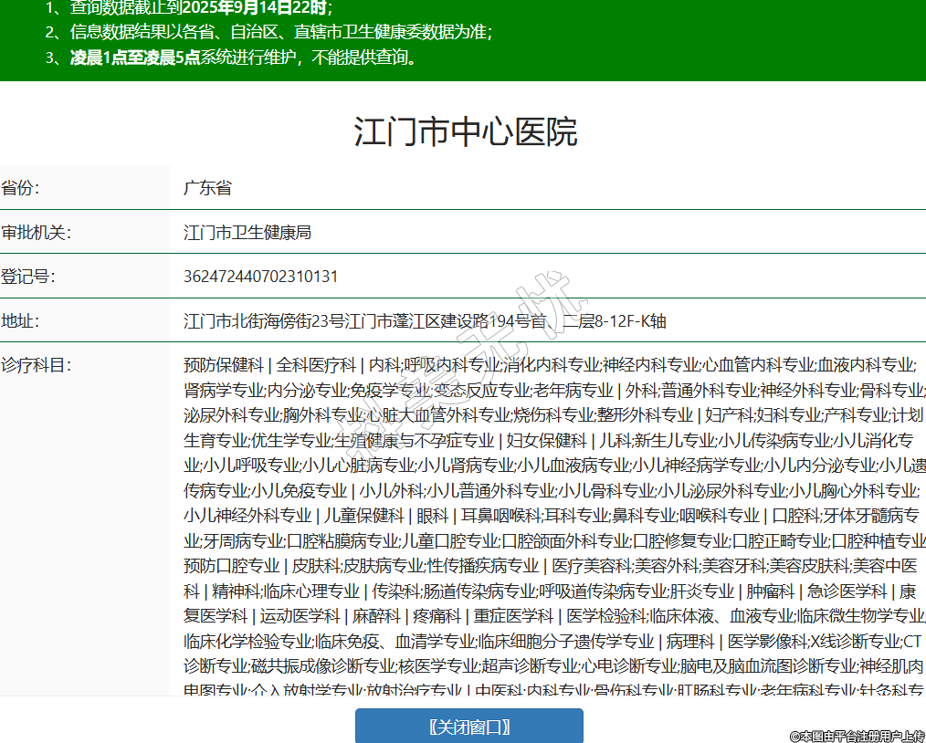 省份:廣東省審批機(jī)關(guān):江門市衛(wèi)生健康局登記號:362472440702310131地址:江門市北街海傍街23號江門市蓬江區(qū)建設(shè)路194號首、二層8-12F-K軸診療科目:預(yù)防保健科 | 全科醫(yī)療科 | 內(nèi)科;呼吸內(nèi)科專業(yè);消化內(nèi)科專業(yè);神經(jīng)內(nèi)科專業(yè);心血管內(nèi)科專業(yè);血液內(nèi)科專業(yè);腎病學(xué)專業(yè);內(nèi)分泌專業(yè);免疫學(xué)專業(yè);變態(tài)反應(yīng)專業(yè);老年病專業(yè) | 外科;普通外科專業(yè);神經(jīng)外科專業(yè);骨科專業(yè);泌尿外科專業(yè);胸外科專業(yè);心臟大血管外科專業(yè);燒傷科專業(yè);整形外科專業(yè) | 婦產(chǎn)科;婦科專業(yè);產(chǎn)科專業(yè);計(jì)劃生育專業(yè);優(yōu)生學(xué)專業(yè);生殖健康與不孕癥專業(yè) | 婦女保健科 | 兒科;新生兒專業(yè);小兒傳染病專業(yè);小兒消化專業(yè);小兒呼吸專業(yè);小兒心臟病專業(yè);小兒腎病專業(yè);小兒血液病專業(yè);小兒神經(jīng)病學(xué)專業(yè);小兒內(nèi)分泌專業(yè);小兒遺傳病專業(yè);小兒免疫專業(yè) | 小兒外科;小兒普通外科專業(yè);小兒骨科專業(yè);小兒泌尿外科專業(yè);小兒胸心外科專業(yè);小兒神經(jīng)外科專業(yè) | 兒童保健科 | 眼科 | 耳鼻咽喉科;耳科專業(yè);鼻科專業(yè);咽喉科專業(yè) | 口腔科;牙體牙髓病專業(yè);牙周病專業(yè);口腔粘膜病專業(yè);兒童口腔專業(yè);口腔頜面外科專業(yè);口腔修復(fù)專業(yè);口腔正畸專業(yè);口腔種植專業(yè);預(yù)防口腔專業(yè) | 皮膚科;皮膚病專業(yè);性傳播疾病專業(yè) | 醫(yī)療美容科;美容外科;美容牙科;美容皮膚科;美容中醫(yī)科 | 精神科;臨床心理專業(yè) | 傳染科;腸道傳染病專業(yè);呼吸道傳染病專業(yè);肝炎專業(yè) | 腫瘤科 | 急診醫(yī)學(xué)科 | 康復(fù)醫(yī)學(xué)科 | 運(yùn)動(dòng)醫(yī)學(xué)科 | 麻醉科 | 疼痛科 | 重癥醫(yī)學(xué)科 | 醫(yī)學(xué)檢驗(yàn)科;臨床體液、血液專業(yè);臨床微生物學(xué)專業(yè);臨床化學(xué)檢驗(yàn)專業(yè);臨床免疫、血清學(xué)專業(yè);臨床細(xì)胞分子遺傳學(xué)專業(yè) | 病理科 | 醫(yī)學(xué)影像科;X線診斷專業(yè);CT診斷專業(yè);磁共振成像診斷專業(yè);核醫(yī)學(xué)專業(yè);超聲診斷專業(yè);心電診斷專業(yè);腦電及腦血流圖診斷專業(yè);神經(jīng)肌肉電圖專業(yè);介入放射學(xué)專業(yè);放射治療專業(yè) | 中醫(yī)科;內(nèi)科專業(yè);骨傷科專業(yè);肛腸科專業(yè);老年病科專業(yè);針灸科專業(yè);推拿科專業(yè);預(yù)防保健科專業(yè) | 中西醫(yī)結(jié)合科******級別:三級法定代表人:阮曉紅主要負(fù)責(zé)人:阮曉紅執(zhí)業(yè)許可證有效期:2025/08/05 -至- 2040/08/04 -