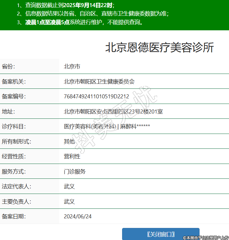 省份:北京市備案機(jī)關(guān):北京市朝陽區(qū)衛(wèi)生健康委員會備案編號:76847492411010519D2212地址:北京市朝陽區(qū)安貞西里四區(qū)23號2樓201室診療科目:醫(yī)療美容科(美容外科) | 麻醉科******所有制形式:其他經(jīng)營性質(zhì):營利性服務(wù)方式:門診服務(wù)法定代表人:武義主要負(fù)責(zé)人:武義備案日期:2024/06/24 -