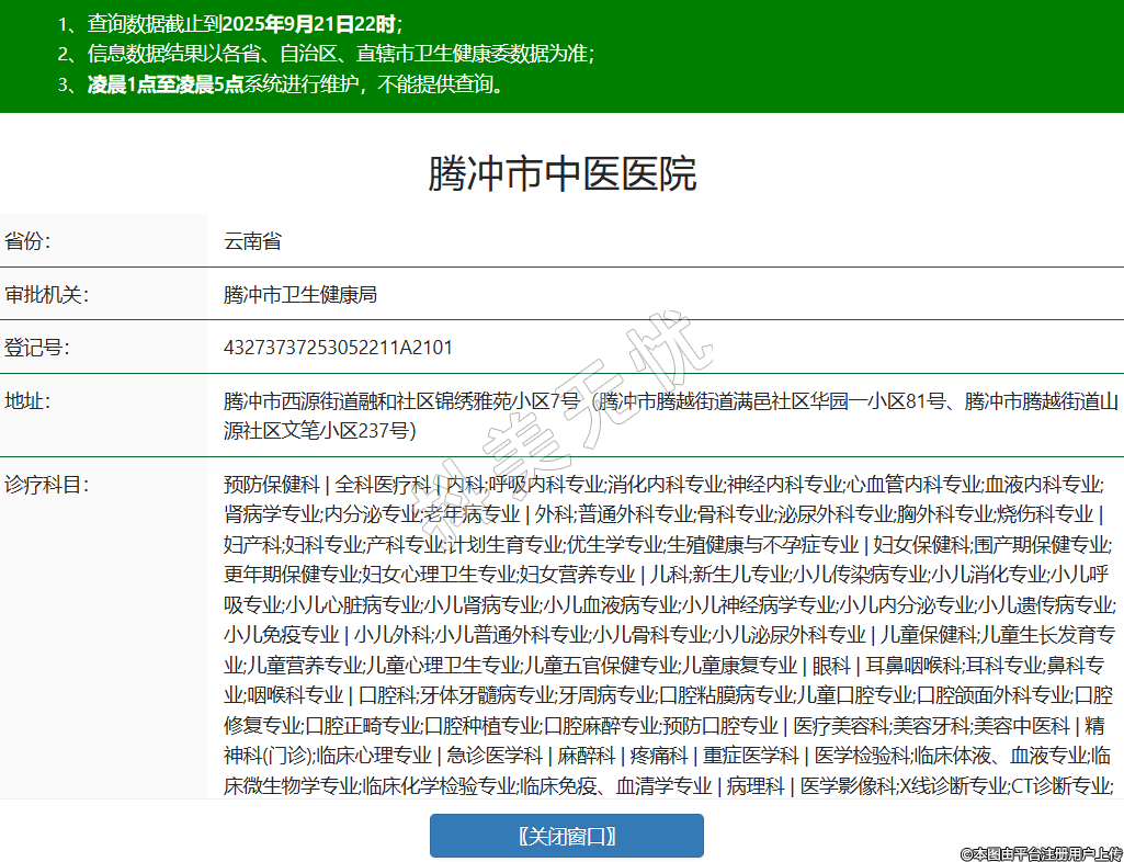 省份:云南省審批機關:騰沖市衛(wèi)生健康局登記號:43273737253052211A2101地址:騰沖市西源街道融和社區(qū)錦繡雅苑小區(qū)7號(騰沖市騰越街道滿邑社區(qū)華園一小區(qū)81號、騰沖市騰越街道山源社區(qū)文筆小區(qū)237號)診療科目:預防保健科 | 全科醫(yī)療科 | 內科;呼吸內科專業(yè);消化內科專業(yè);神經內科專業(yè);心血管內科專業(yè);血液內科專業(yè);腎病學專業(yè);內分泌專業(yè);老年病專業(yè) | 外科;普通外科專業(yè);骨科專業(yè);泌尿外科專業(yè);胸外科專業(yè);燒傷科專業(yè) | 婦產科;婦科專業(yè);產科專業(yè);計劃生育專業(yè);優(yōu)生學專業(yè);生殖健康與不孕癥專業(yè) | 婦女保健科;圍產期保健專業(yè);更年期保健專業(yè);婦女心理衛(wèi)生專業(yè);婦女營養(yǎng)專業(yè) | 兒科;新生兒專業(yè);小兒傳染病專業(yè);小兒消化專業(yè);小兒呼吸專業(yè);小兒心臟病專業(yè);小兒腎病專業(yè);小兒血液病專業(yè);小兒神經病學專業(yè);小兒內分泌專業(yè);小兒遺傳病專業(yè);小兒免疫專業(yè) | 小兒外科;小兒普通外科專業(yè);小兒骨科專業(yè);小兒泌尿外科專業(yè) | 兒童保健科;兒童生長發(fā)育專業(yè);兒童營養(yǎng)專業(yè);兒童心理衛(wèi)生專業(yè);兒童五官保健專業(yè);兒童康復專業(yè) | 眼科 | 耳鼻咽喉科;耳科專業(yè);鼻科專業(yè);咽喉科專業(yè) | 口腔科;牙體牙髓病專業(yè);牙周病專業(yè);口腔粘膜病專業(yè);兒童口腔專業(yè);口腔頜面外科專業(yè);口腔修復專業(yè);口腔正畸專業(yè);口腔種植專業(yè);口腔麻醉專業(yè);預防口腔專業(yè) | 醫(yī)療美容科;美容牙科;美容中醫(yī)科 | 精神科(門診);臨床心理專業(yè) | 急診醫(yī)學科 | 麻醉科 | 疼痛科 | 重癥醫(yī)學科 | 醫(yī)學檢驗科;臨床體液、血液專業(yè);臨床微生物學專業(yè);臨床化學檢驗專業(yè);臨床免疫、血清學專業(yè) | 病理科 | 醫(yī)學影像科;X線診斷專業(yè);CT診斷專業(yè);超聲診斷專業(yè);心電診斷專業(yè);腦電及腦血流圖診斷專業(yè);介入放射學專業(yè) | 中醫(yī)科;內科專業(yè);外科專業(yè);婦產科專業(yè);兒科專業(yè);皮膚科專業(yè);眼科專業(yè);耳鼻咽喉科專業(yè);口腔科專業(yè);腫瘤科專業(yè);骨傷科專業(yè);肛腸科專業(yè);老年病科專業(yè);針灸科專業(yè);推拿科專業(yè);康復醫(yī)學專業(yè);急診科專業(yè);預防保健科專業(yè)(治未病科) | 中西醫(yī)結合科******級別:三級法定代表人:謝兆明主要負責人:謝兆明執(zhí)業(yè)許可證有效期:2025/05/19 -至- 2034/11/03 -