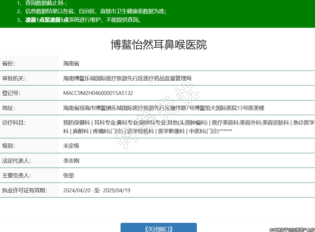 省份:海南省審批機(jī)關(guān):海南博鰲樂城國(guó)際醫(yī)療旅游先行區(qū)醫(yī)療藥品監(jiān)督管理局登記號(hào):MACC9M2H046000015A5132地址:海南省瓊海市博鰲鎮(zhèn)樂城國(guó)際醫(yī)療旅游先行區(qū)康祥路7號(hào)博鰲恒大國(guó)際醫(yī)院13號(hào)醫(yī)美樓診療科目:預(yù)防保健科 | 耳科專業(yè);鼻科專業(yè);咽喉科專業(yè);其他(頭頸腫瘤科) | 醫(yī)療美容科;美容外科;美容皮膚科 | 急診醫(yī)學(xué)科 | 麻醉科 | 疼痛科(門診) | 醫(yī)學(xué)檢驗(yàn)科 | 醫(yī)學(xué)影像科 | 中醫(yī)科(門診)******級(jí)別:未定級(jí)法定代表人:李志剛主要負(fù)責(zé)人:張勁執(zhí)業(yè)許可證有效期:2024/04/20 -至- 2029/04/19 -