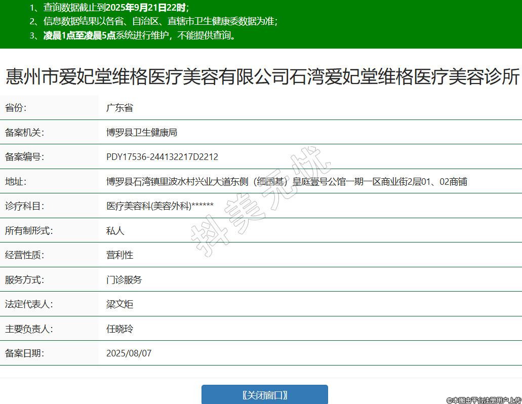 省份:廣東省備案機(jī)關(guān):博羅縣衛(wèi)生健康局備案編號(hào):PDY17536-244132217D2212地址:博羅縣石灣鎮(zhèn)里波水村興業(yè)大道東側(cè)(細(xì)圍基)皇庭壹號(hào)公館一期一區(qū)商業(yè)街2層01、02商鋪診療科目:醫(yī)療美容科(美容外科)******所有制形式:私人經(jīng)營(yíng)性質(zhì):營(yíng)利性服務(wù)方式:門診服務(wù)法定代表人:梁文炬主要負(fù)責(zé)人:任曉玲備案日期:2025/08/07 -
