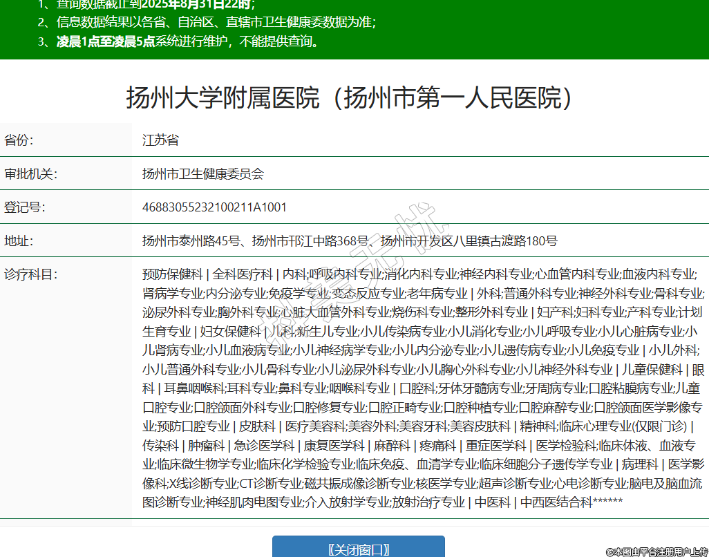 省份:江蘇省審批機關(guān):揚州市衛(wèi)生健康委員會登記號:46883055232100211A1001地址:揚州市泰州路45號、揚州市邗江中路368號、揚州市開發(fā)區(qū)八里鎮(zhèn)古渡路180號診療科目:預(yù)防保健科 | 全科醫(yī)療科 | 內(nèi)科;呼吸內(nèi)科專業(yè);消化內(nèi)科專業(yè);神經(jīng)內(nèi)科專業(yè);心血管內(nèi)科專業(yè);血液內(nèi)科專業(yè);腎病學(xué)專業(yè);內(nèi)分泌專業(yè);免疫學(xué)專業(yè);變態(tài)反應(yīng)專業(yè);老年病專業(yè) | 外科;普通外科專業(yè);神經(jīng)外科專業(yè);骨科專業(yè);泌尿外科專業(yè);胸外科專業(yè);心臟大血管外科專業(yè);燒傷科專業(yè);整形外科專業(yè) | 婦產(chǎn)科;婦科專業(yè);產(chǎn)科專業(yè);計劃生育專業(yè) | 婦女保健科 | 兒科;新生兒專業(yè);小兒傳染病專業(yè);小兒消化專業(yè);小兒呼吸專業(yè);小兒心臟病專業(yè);小兒腎病專業(yè);小兒血液病專業(yè);小兒神經(jīng)病學(xué)專業(yè);小兒內(nèi)分泌專業(yè);小兒遺傳病專業(yè);小兒免疫專業(yè) | 小兒外科;小兒普通外科專業(yè);小兒骨科專業(yè);小兒泌尿外科專業(yè);小兒胸心外科專業(yè);小兒神經(jīng)外科專業(yè) | 兒童保健科 | 眼科 | 耳鼻咽喉科;耳科專業(yè);鼻科專業(yè);咽喉科專業(yè) | 口腔科;牙體牙髓病專業(yè);牙周病專業(yè);口腔粘膜病專業(yè);兒童口腔專業(yè);口腔頜面外科專業(yè);口腔修復(fù)專業(yè);口腔正畸專業(yè);口腔種植專業(yè);口腔麻醉專業(yè);口腔頜面醫(yī)學(xué)影像專業(yè);預(yù)防口腔專業(yè) | 皮膚科 | 醫(yī)療美容科;美容外科;美容牙科;美容皮膚科 | 精神科;臨床心理專業(yè)(僅限門診) | 傳染科 | 腫瘤科 | 急診醫(yī)學(xué)科 | 康復(fù)醫(yī)學(xué)科 | 麻醉科 | 疼痛科 | 重癥醫(yī)學(xué)科 | 醫(yī)學(xué)檢驗科;臨床體液、血液專業(yè);臨床微生物學(xué)專業(yè);臨床化學(xué)檢驗專業(yè);臨床免疫、血清學(xué)專業(yè);臨床細胞分子遺傳學(xué)專業(yè) | 病理科 | 醫(yī)學(xué)影像科;X線診斷專業(yè);CT診斷專業(yè);磁共振成像診斷專業(yè);核醫(yī)學(xué)專業(yè);超聲診斷專業(yè);心電診斷專業(yè);腦電及腦血流圖診斷專業(yè);神經(jīng)肌肉電圖專業(yè);介入放射學(xué)專業(yè);放射治療專業(yè) | 中醫(yī)科 | 中西醫(yī)結(jié)合科******級別:三級法定代表人:龔開政主要負責人:龔開政執(zhí)業(yè)許可證有效期:2025/08/26 -至- 2036/01/24 -