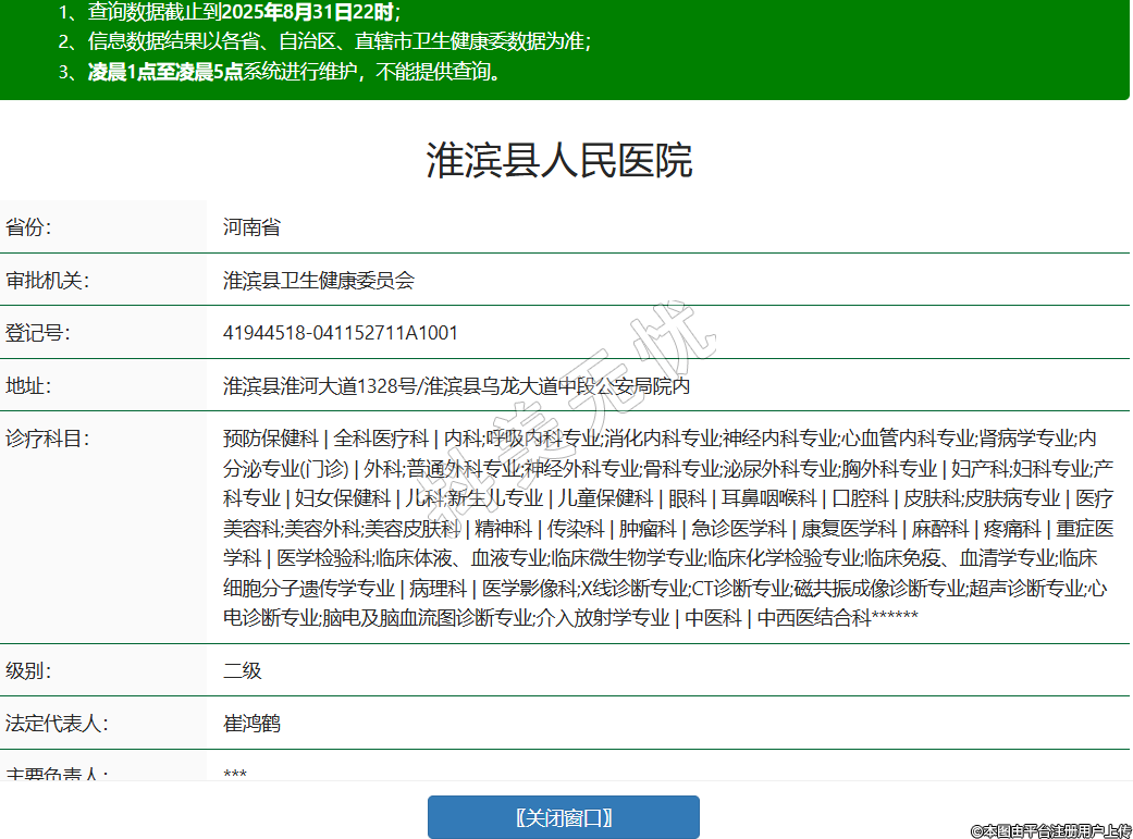省份:河南省審批機(jī)關(guān):淮濱縣衛(wèi)生健康委員會登記號:41944518-041152711A1001地址:淮濱縣淮河大道1328號/淮濱縣烏龍大道中段公安局院內(nèi)診療科目:預(yù)防保健科 | 全科醫(yī)療科 | 內(nèi)科;呼吸內(nèi)科專業(yè);消化內(nèi)科專業(yè);神經(jīng)內(nèi)科專業(yè);心血管內(nèi)科專業(yè);腎病學(xué)專業(yè);內(nèi)分泌專業(yè)(門診) | 外科;普通外科專業(yè);神經(jīng)外科專業(yè);骨科專業(yè);泌尿外科專業(yè);胸外科專業(yè) | 婦產(chǎn)科;婦科專業(yè);產(chǎn)科專業(yè) | 婦女保健科 | 兒科;新生兒專業(yè) | 兒童保健科 | 眼科 | 耳鼻咽喉科 | 口腔科 | 皮膚科;皮膚病專業(yè) | 醫(yī)療美容科;美容外科;美容皮膚科 | 精神科 | 傳染科 | 腫瘤科 | 急診醫(yī)學(xué)科 | 康復(fù)醫(yī)學(xué)科 | 麻醉科 | 疼痛科 | 重癥醫(yī)學(xué)科 | 醫(yī)學(xué)檢驗(yàn)科;臨床體液、血液專業(yè);臨床微生物學(xué)專業(yè);臨床化學(xué)檢驗(yàn)專業(yè);臨床免疫、血清學(xué)專業(yè);臨床細(xì)胞分子遺傳學(xué)專業(yè) | 病理科 | 醫(yī)學(xué)影像科;X線診斷專業(yè);CT診斷專業(yè);磁共振成像診斷專業(yè);超聲診斷專業(yè);心電診斷專業(yè);腦電及腦血流圖診斷專業(yè);介入放射學(xué)專業(yè) | 中醫(yī)科 | 中西醫(yī)結(jié)合科******級別:二級法定代表人:崔鴻鶴主要負(fù)責(zé)人:***執(zhí)業(yè)許可證有效期:2024/02/20 -至- 2030/05/15 -